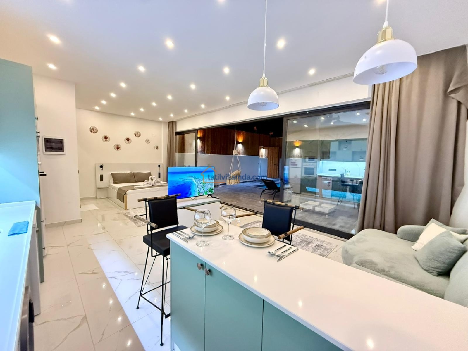 Villanın mutfak, salon ve yatak odası tek bir açık plan alan içerisinde tasarlanmıştır. Bu düzen, alanın daha ferah ve kullanışlı olmasını sağlarken, modern ve sade dekorasyonla konfor ön planda tutulmuştur. Günlük ihtiyaçlarınızı rahatlıkla karşılayabileceğiniz donanımlı mutfağı ve dinlenmeye uygun salon alanı ile ev rahatlığında bir konaklama sunar.