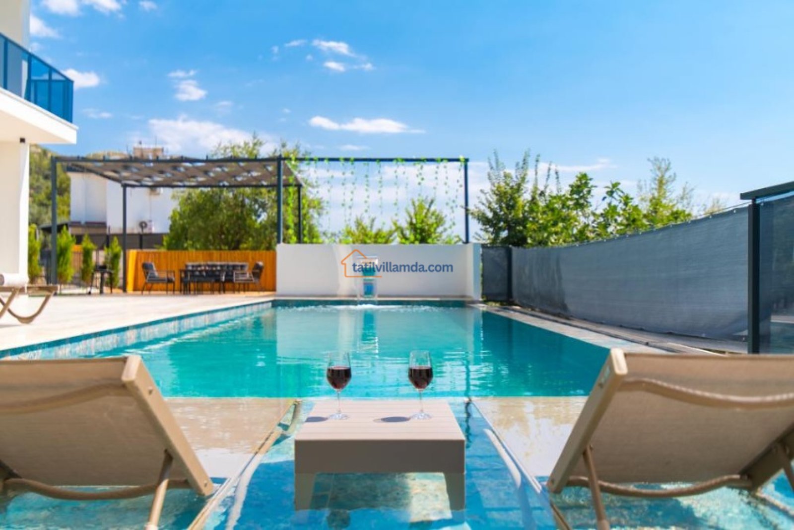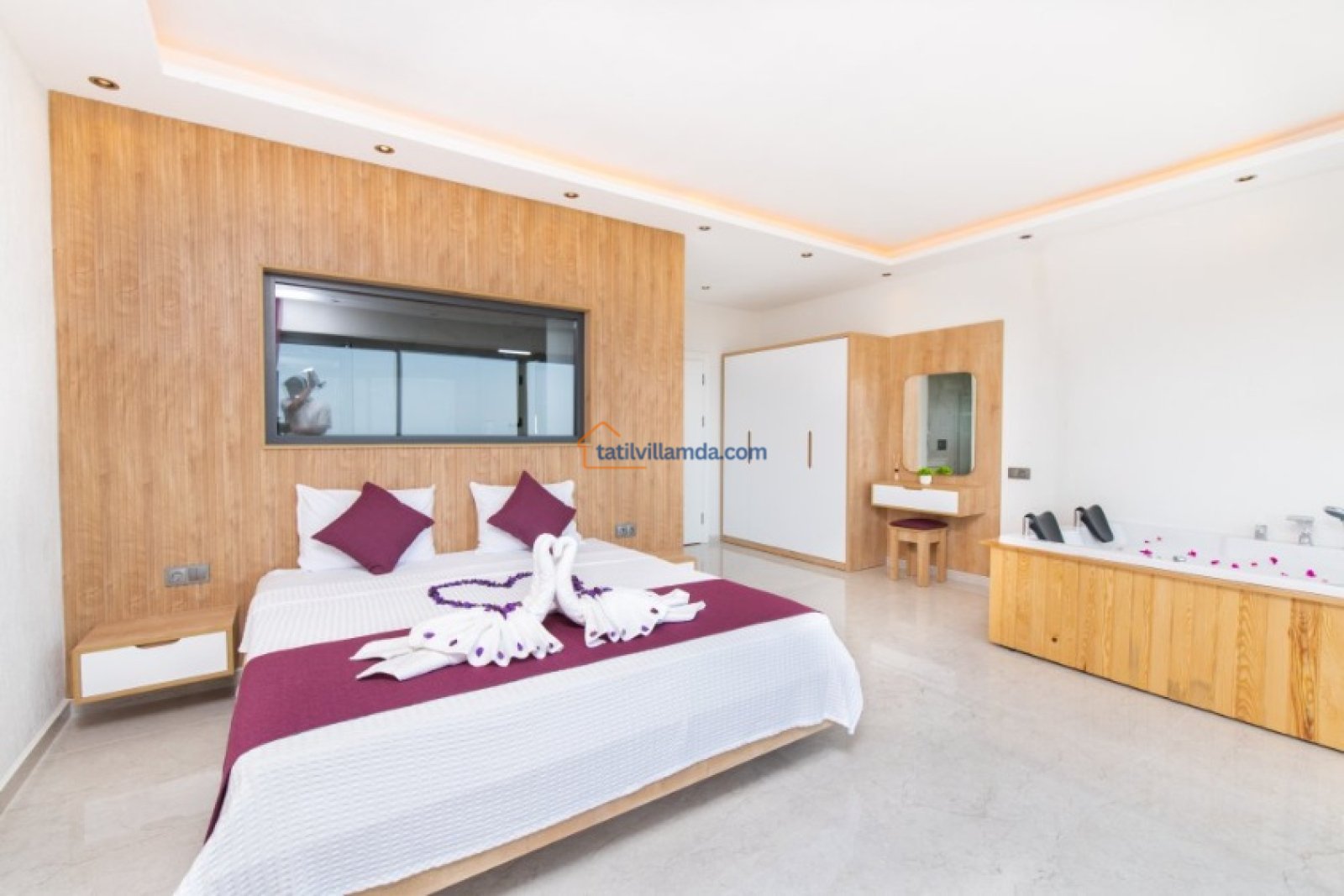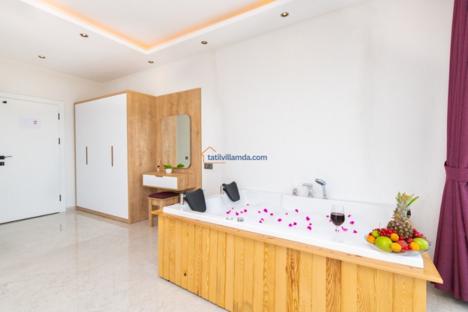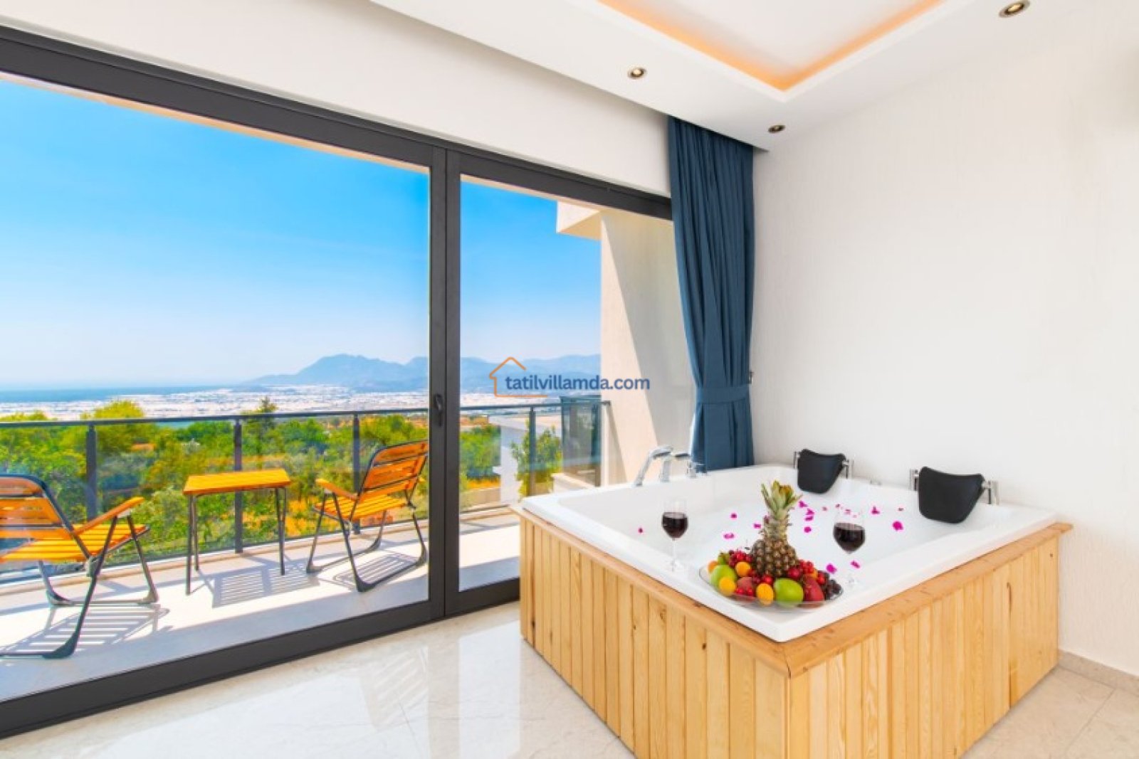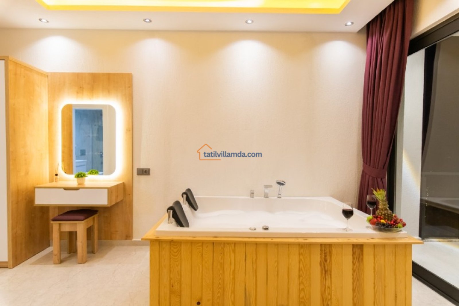 Villanın en dikkat çekici özelliklerinden biri, 12,5 metre uzunluğundaki korunaklı yüzme havuzudur. Bu havuz, dışarıdan görünmeyecek şekilde tasarlanmış olup mahremiyet arayan misafirler için idealdir. Ayrıca villada iki adet jakuzi bulunmakta olup konforu üst seviyeye çıkarır.