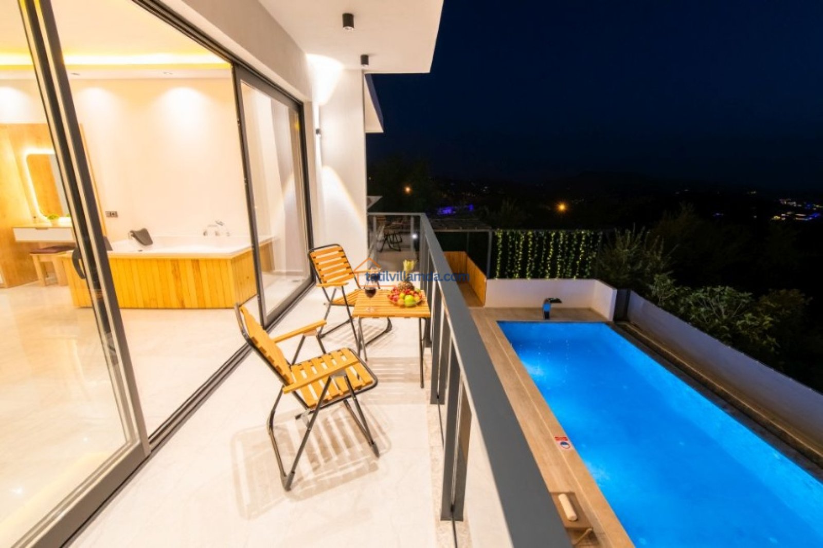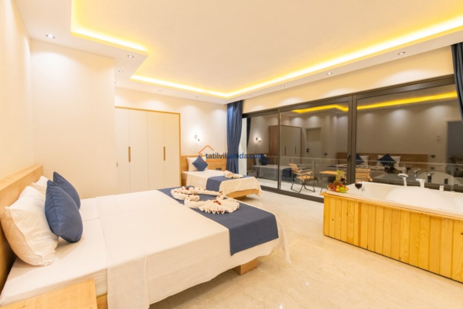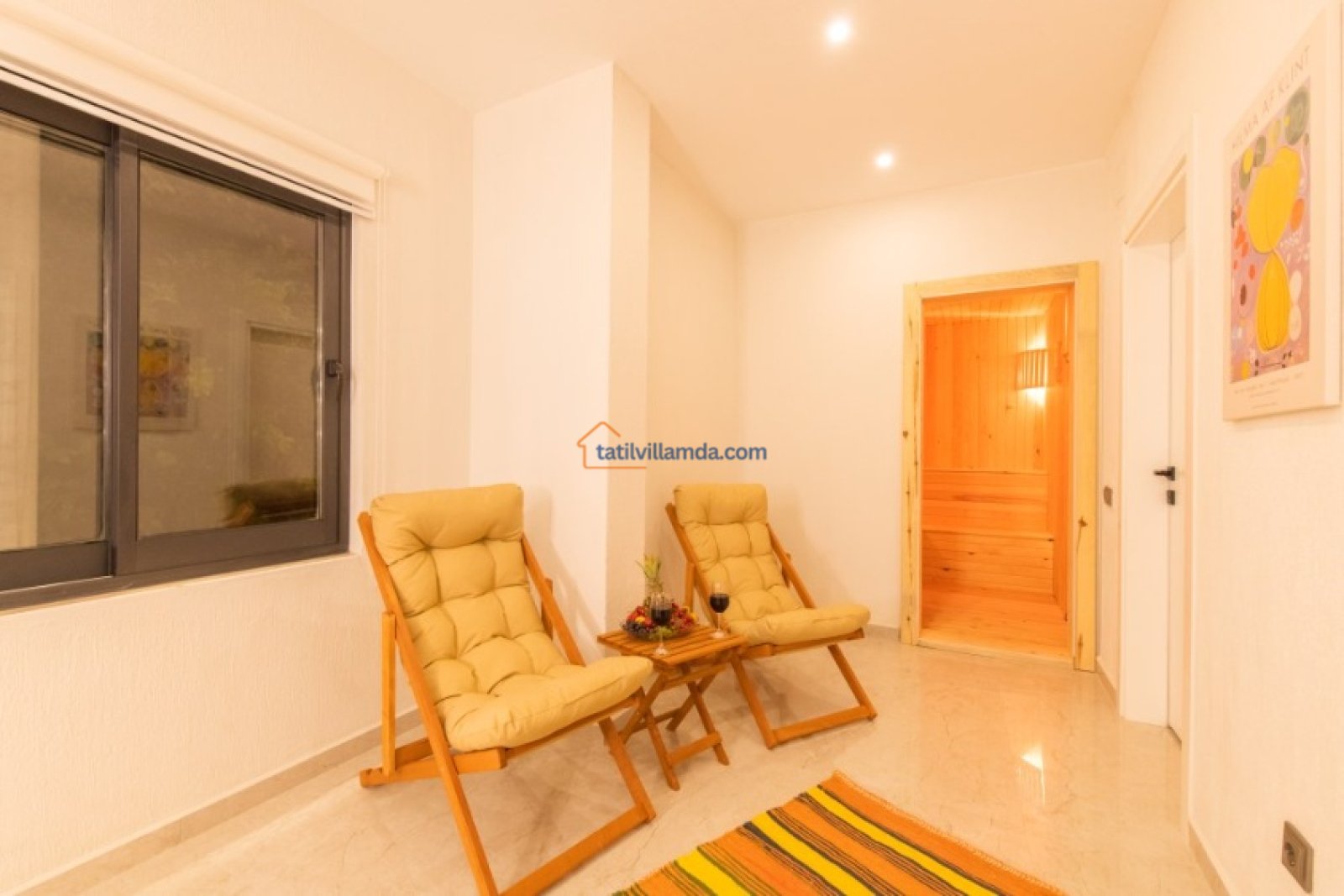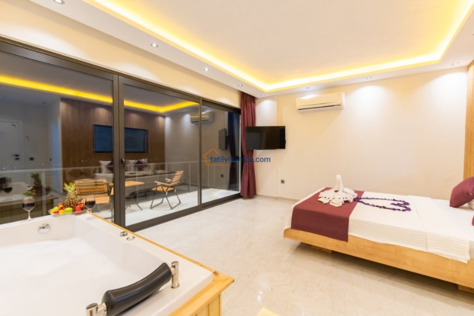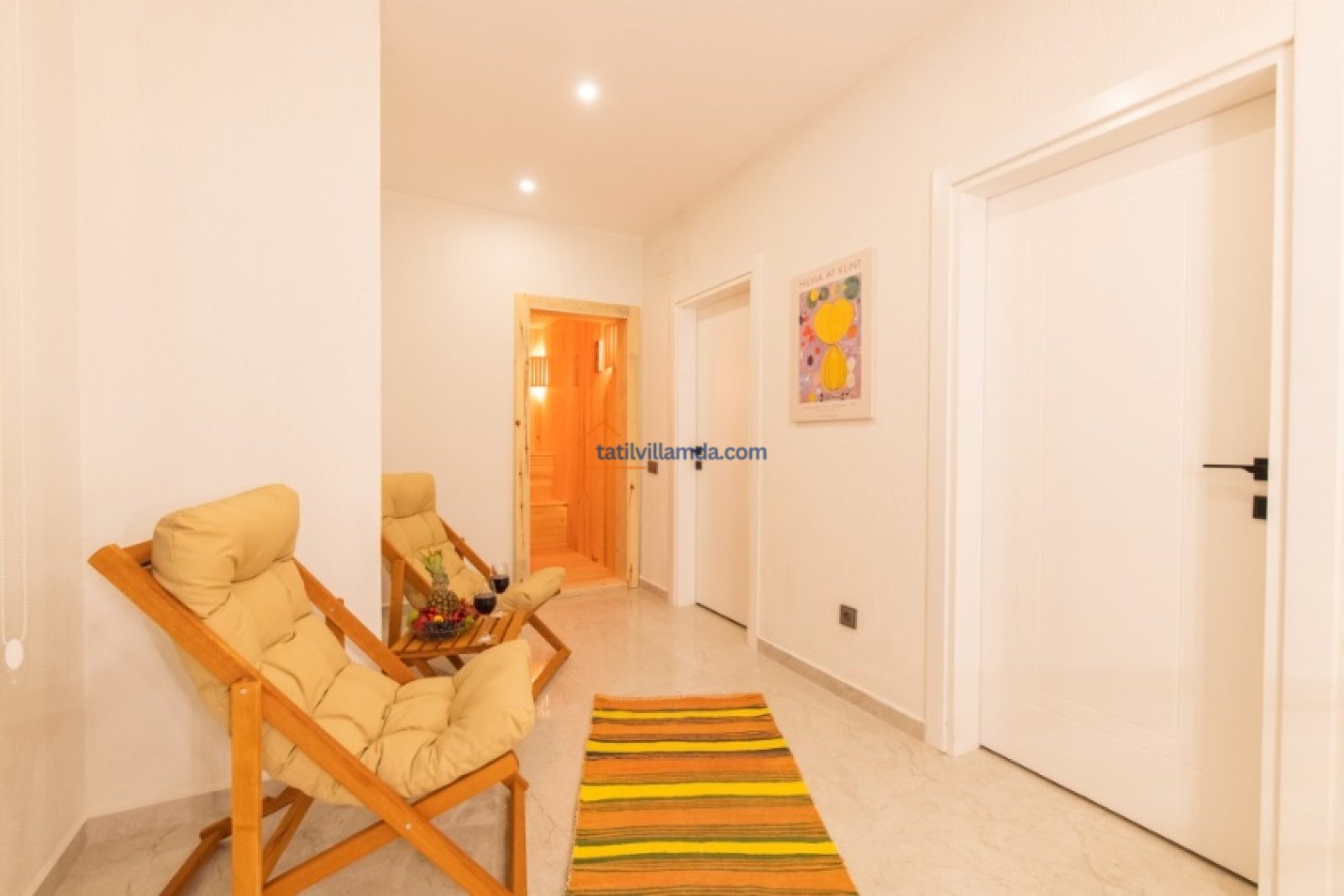 Villanın en dikkat çekici özelliklerinden biri, 12,5 metre uzunluğundaki korunaklı yüzme havuzudur. Bu havuz, dışarıdan görünmeyecek şekilde tasarlanmış olup mahremiyet arayan misafirler için idealdir. Ayrıca villada iki adet jakuzi bulunmakta olup konforu üst seviyeye çıkarır.