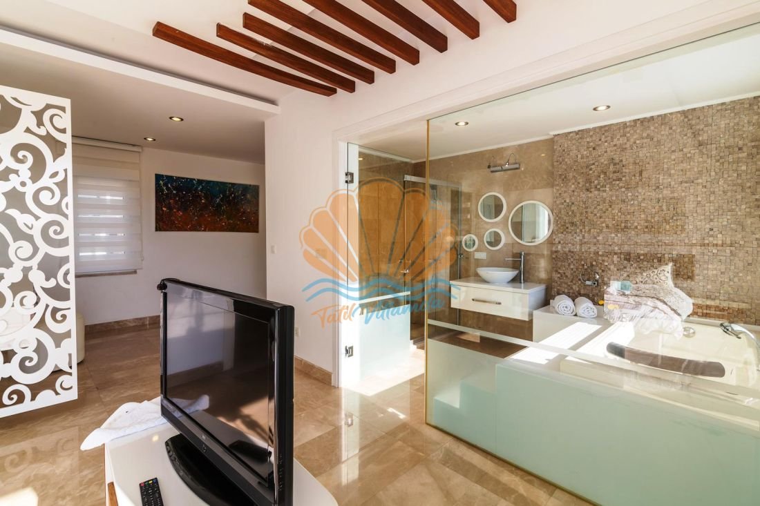Villanın tüm yatak odaları ebeveyn banyoludur. Bu sayede her misafir için özel kullanım alanı ve maksimum konfor sağlanır. Odalardan birinde bulunan jakuzi, özellikle dinlenmek ve rahatlamak isteyen misafirler için ayrıcalıklı bir deneyim sunar. Şık ve kullanışlı salon alanı, tam donanımlı mutfak ve geniş yemek bölümü ile uzun süreli konaklamalar için de uygundur.