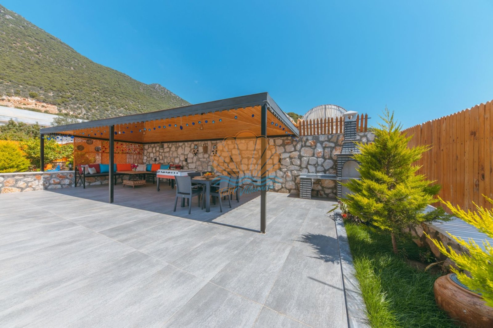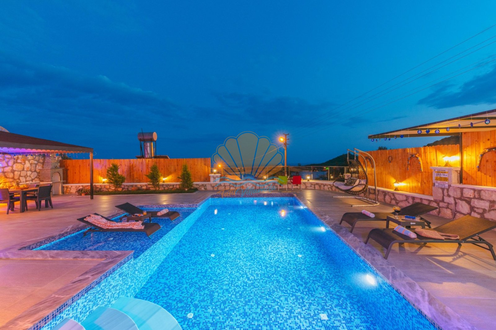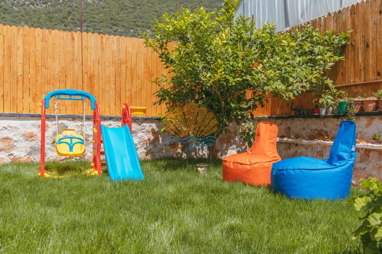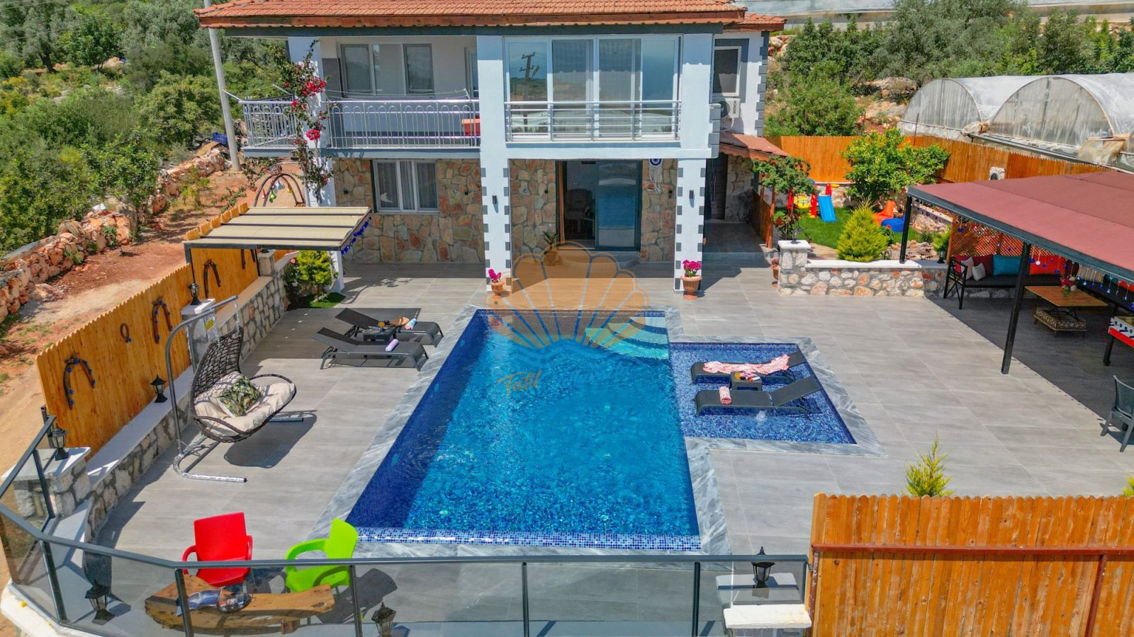 Villa Mercan’ın geniş bahçe alanında tatilin keyfini doyasıya çıkarabileceğiniz birçok detay düşünülmüştür. Havuz başında şezlong ve şemsiye, keyifli akşam yemekleri için masa takımı ve barbekü alanı yer alırken; salıncak ve bahçe oturma grubu dinlenme anlarınıza eşlik eder. Çocuklu aileler için çocuk oyun parkı, büyükler için ise langırt gibi eğlenceli alanlar bulunmaktadır. Hem dinlenmek hem de keyifli vakit geçirmek isteyen misafirler için ideal bir ortam sunar.