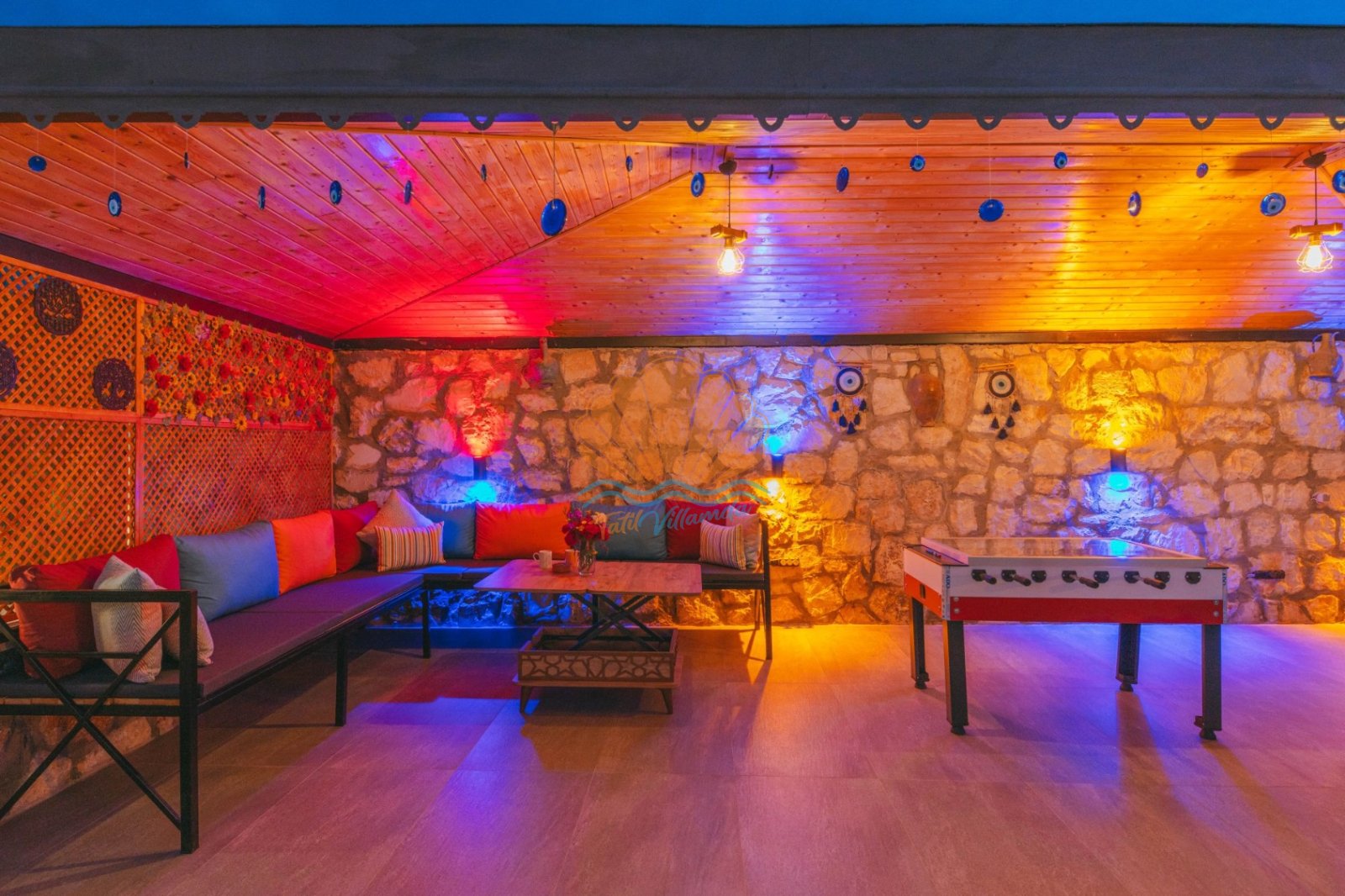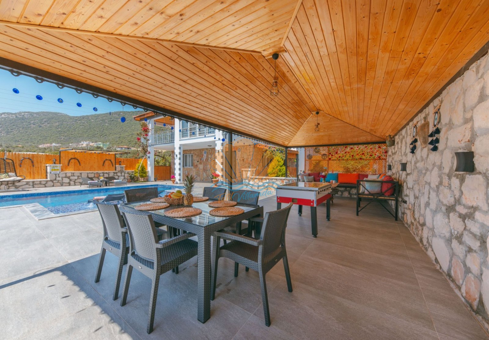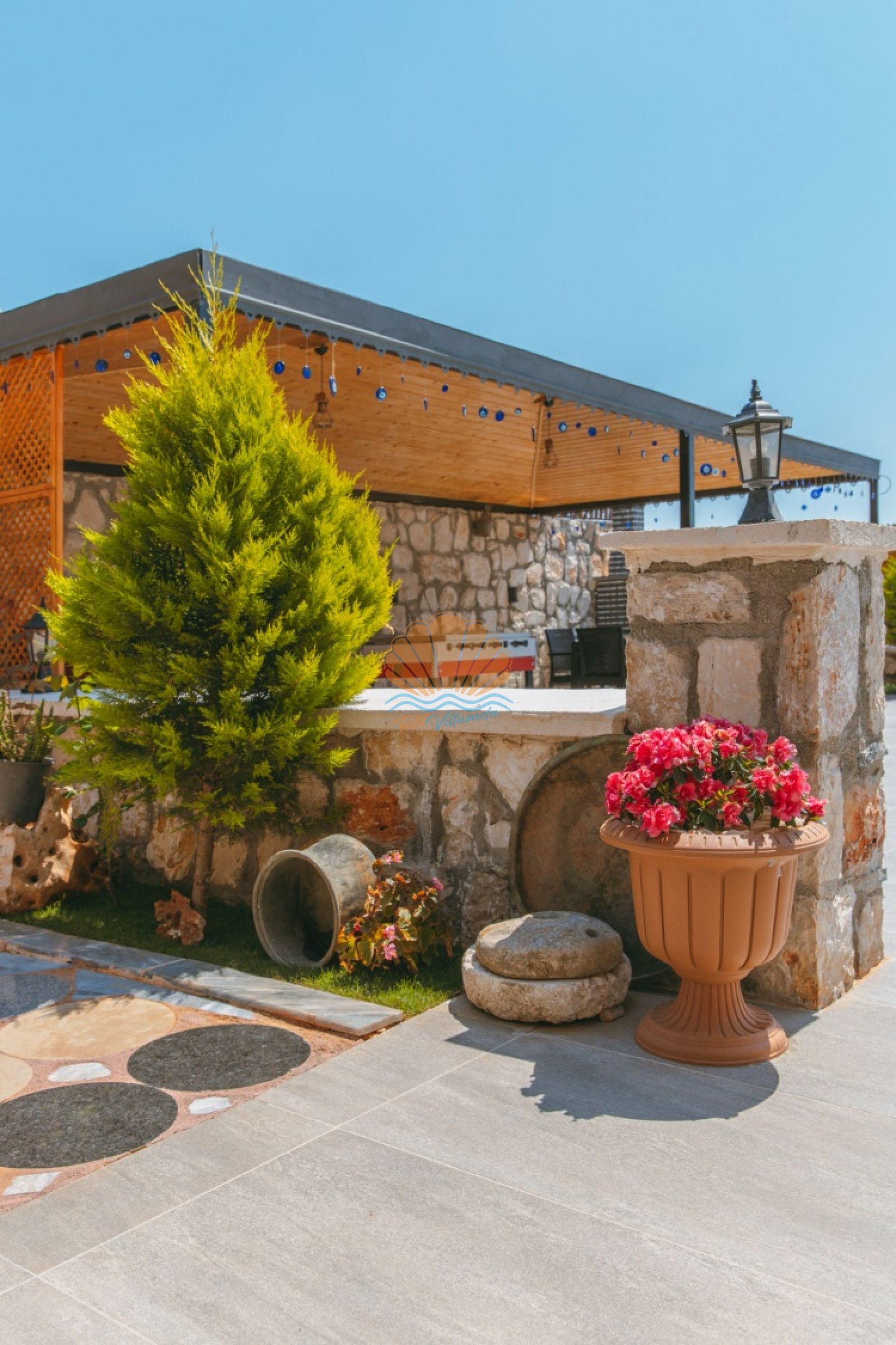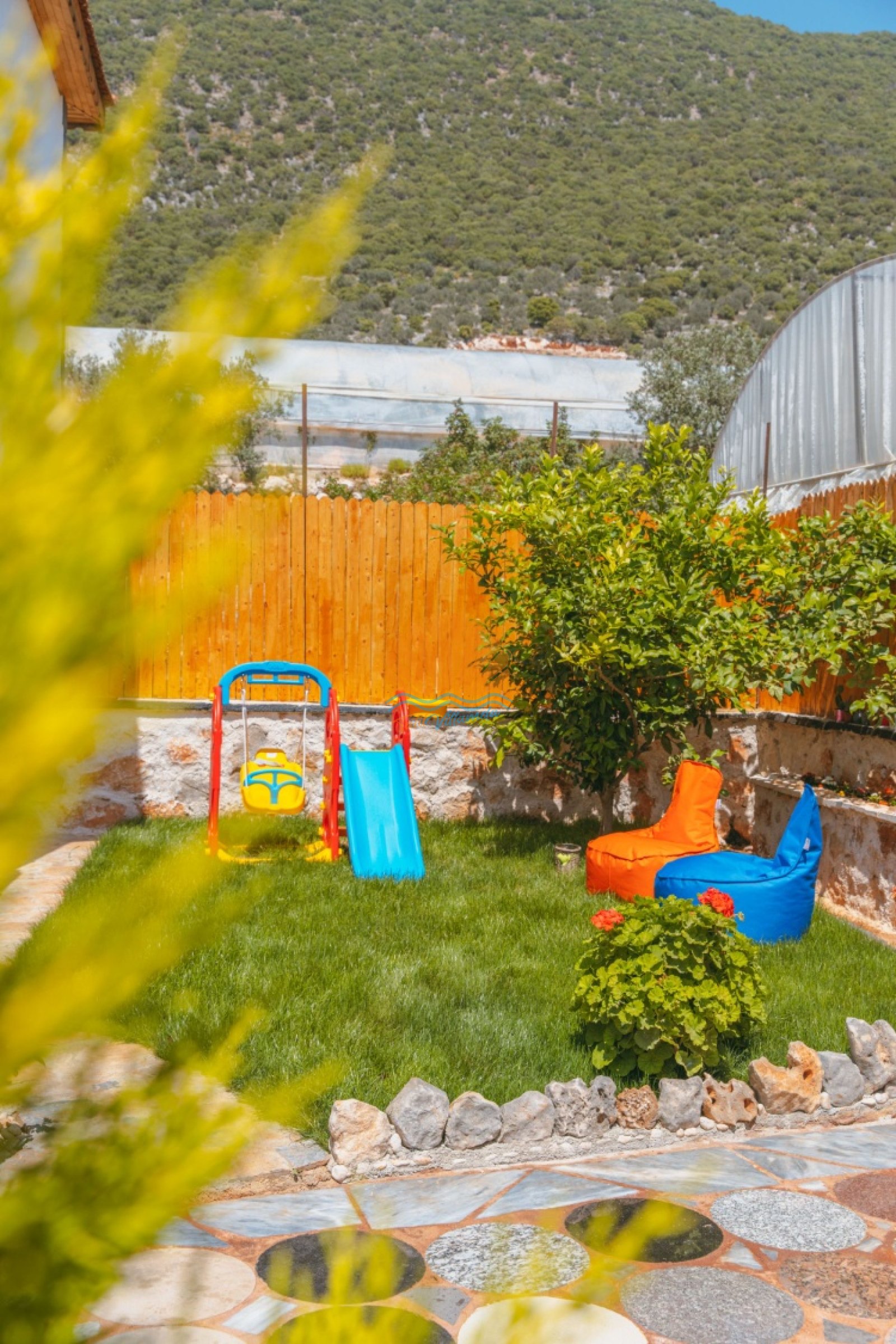 Villa Mercan’ın geniş bahçe alanında tatilin keyfini doyasıya çıkarabileceğiniz birçok detay düşünülmüştür. Havuz başında şezlong ve şemsiye, keyifli akşam yemekleri için masa takımı ve barbekü alanı yer alırken; salıncak ve bahçe oturma grubu dinlenme anlarınıza eşlik eder. Çocuklu aileler için çocuk oyun parkı, büyükler için ise langırt gibi eğlenceli alanlar bulunmaktadır. Hem dinlenmek hem de keyifli vakit geçirmek isteyen misafirler için ideal bir ortam sunar.