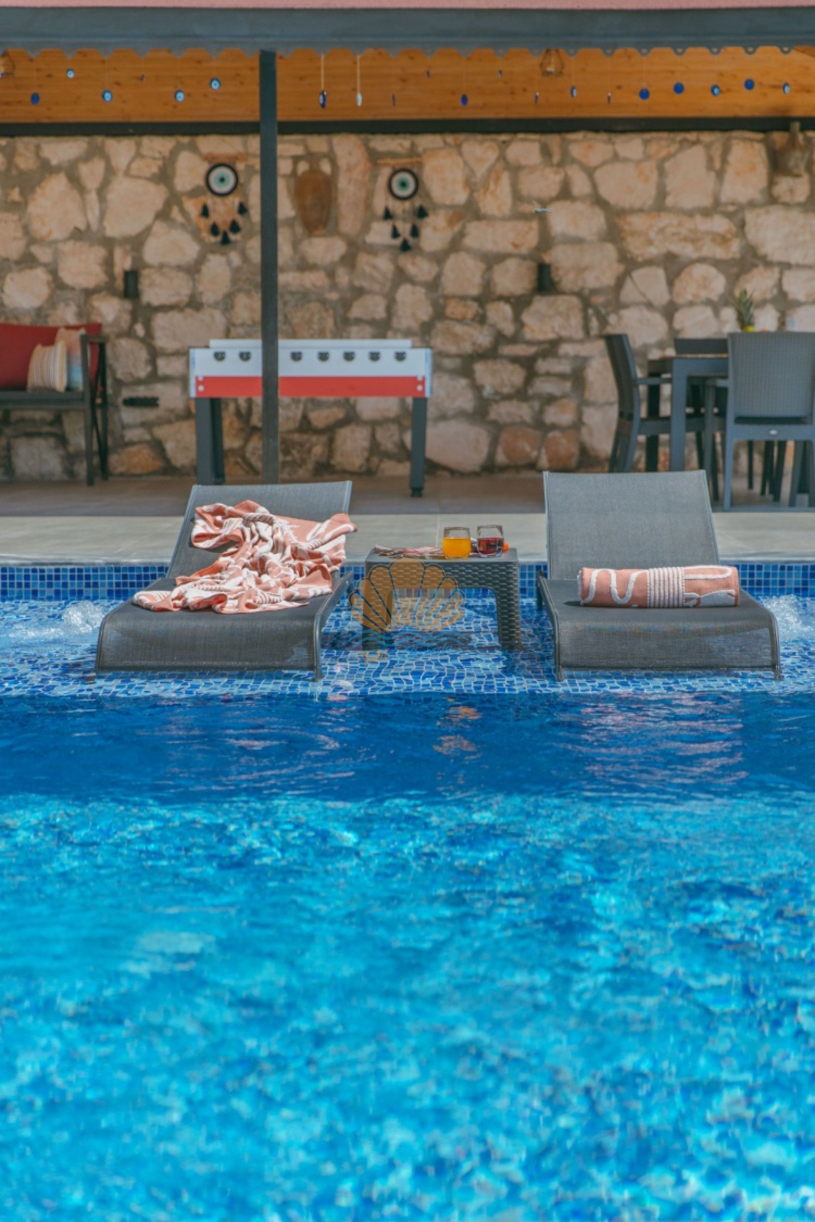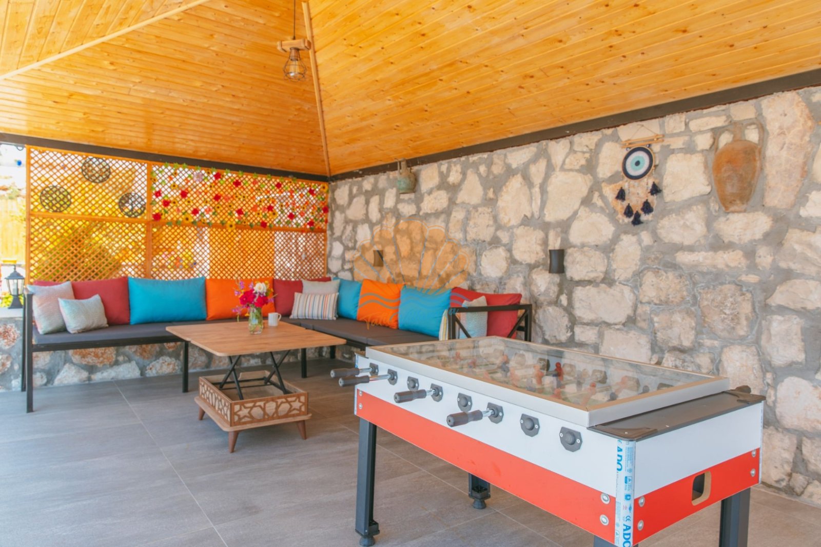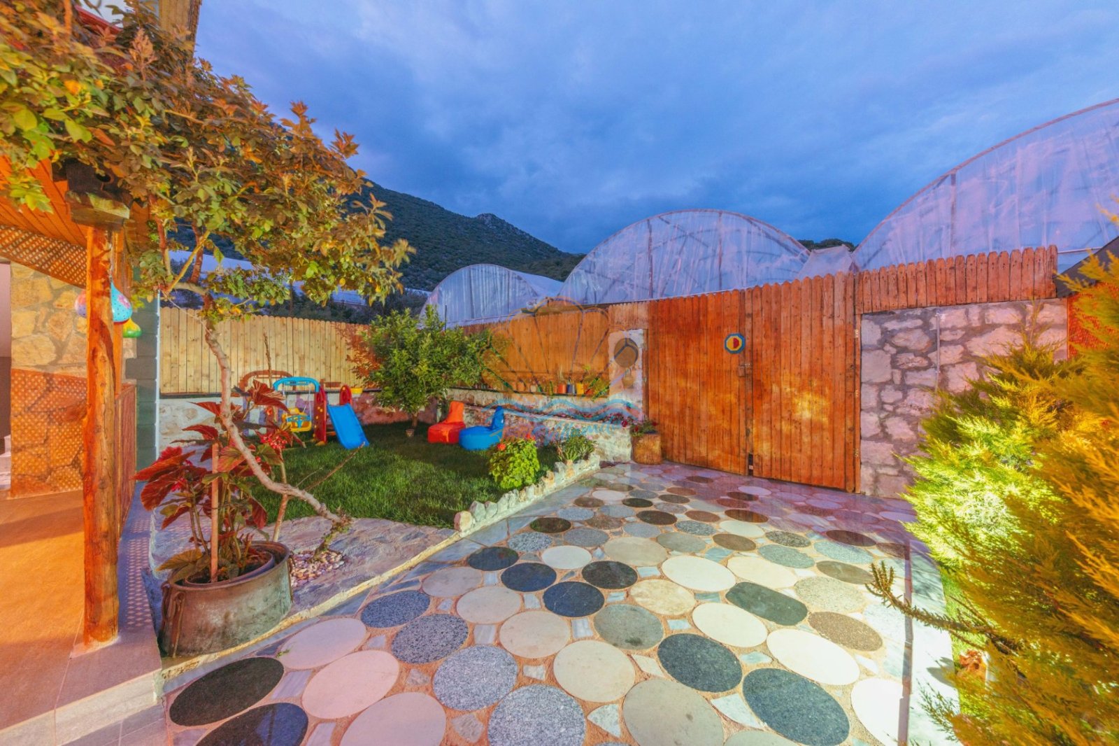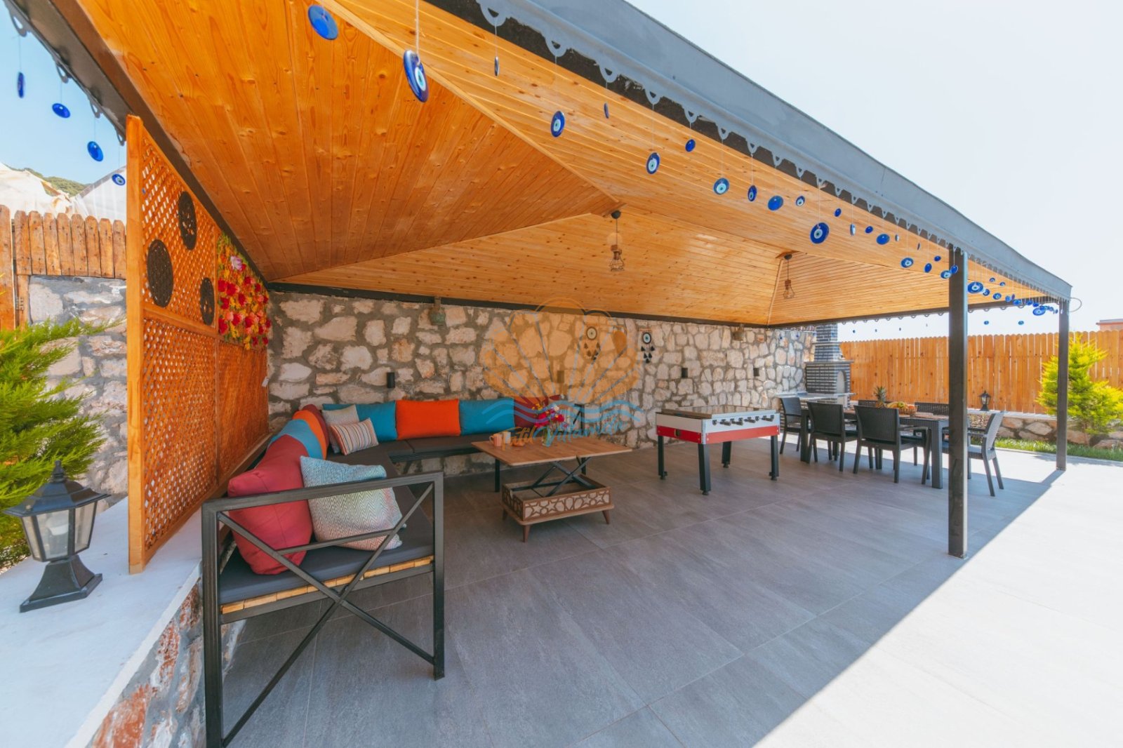Villa Mercan’ın geniş bahçe alanında tatilin keyfini doyasıya çıkarabileceğiniz birçok detay düşünülmüştür. Havuz başında şezlong ve şemsiye, keyifli akşam yemekleri için masa takımı ve barbekü alanı yer alırken; salıncak ve bahçe oturma grubu dinlenme anlarınıza eşlik eder. Çocuklu aileler için çocuk oyun parkı, büyükler için ise langırt gibi eğlenceli alanlar bulunmaktadır. Hem dinlenmek hem de keyifli vakit geçirmek isteyen misafirler için ideal bir ortam sunar.