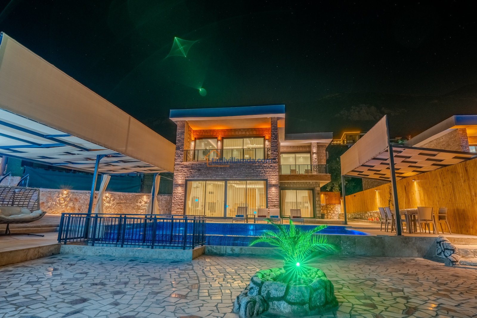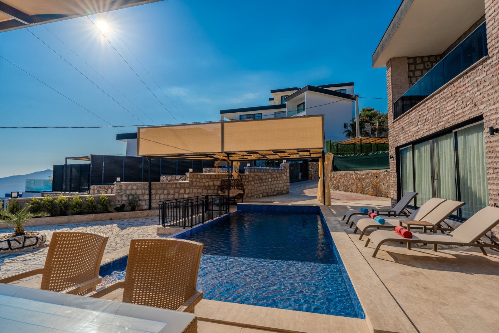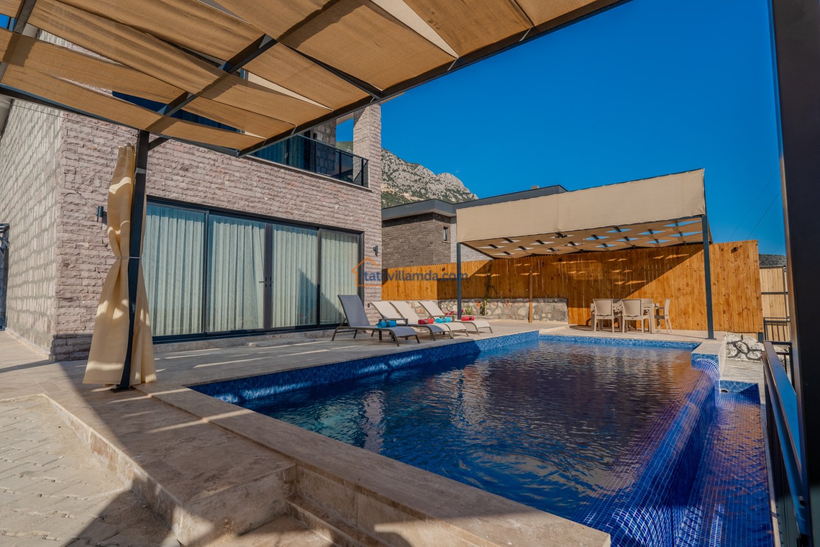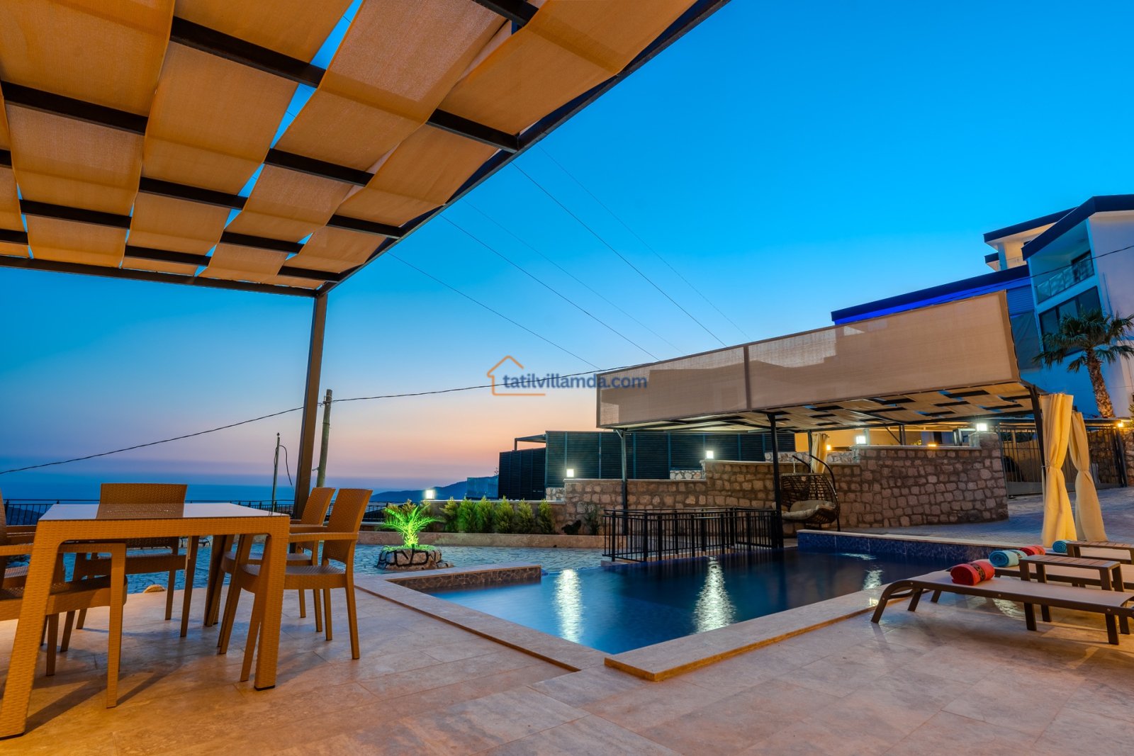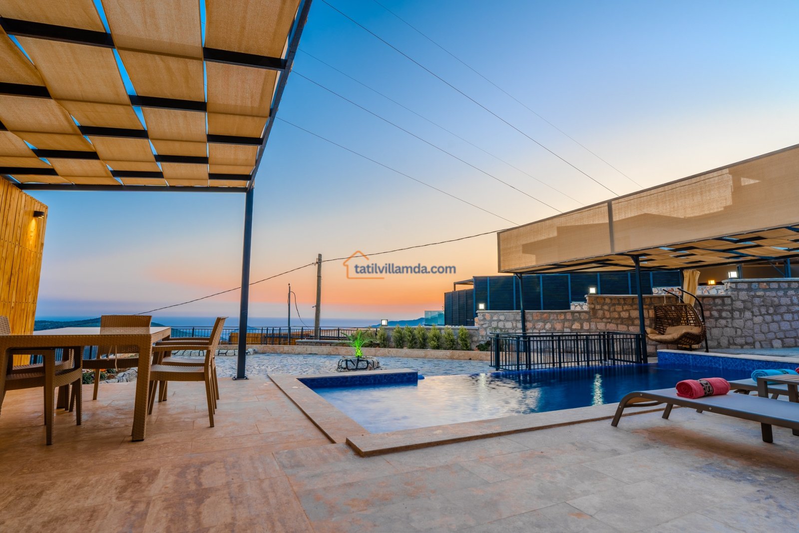Villanın geniş özel yüzme havuzu, tatilin keyfini doyasıya çıkarmanız için tasarlanmıştır. Ayrıca çocuk havuzu da bulunmaktadır, bu sayede küçük misafirler de güvenle eğlenebilir. Havuz terasında şezlong, şemsiye ve salıncak yer alır. Dış mekânda barbekü ve yemek masası grubu sayesinde keyifli akşam yemekleri organize edebilirsiniz.