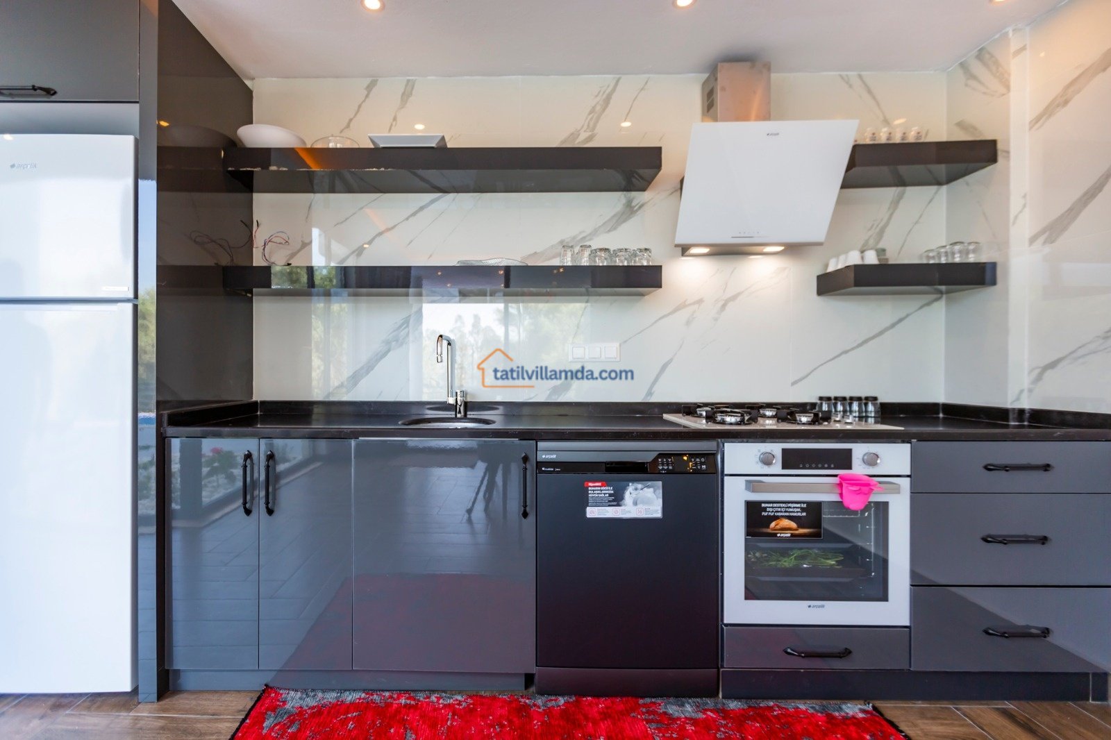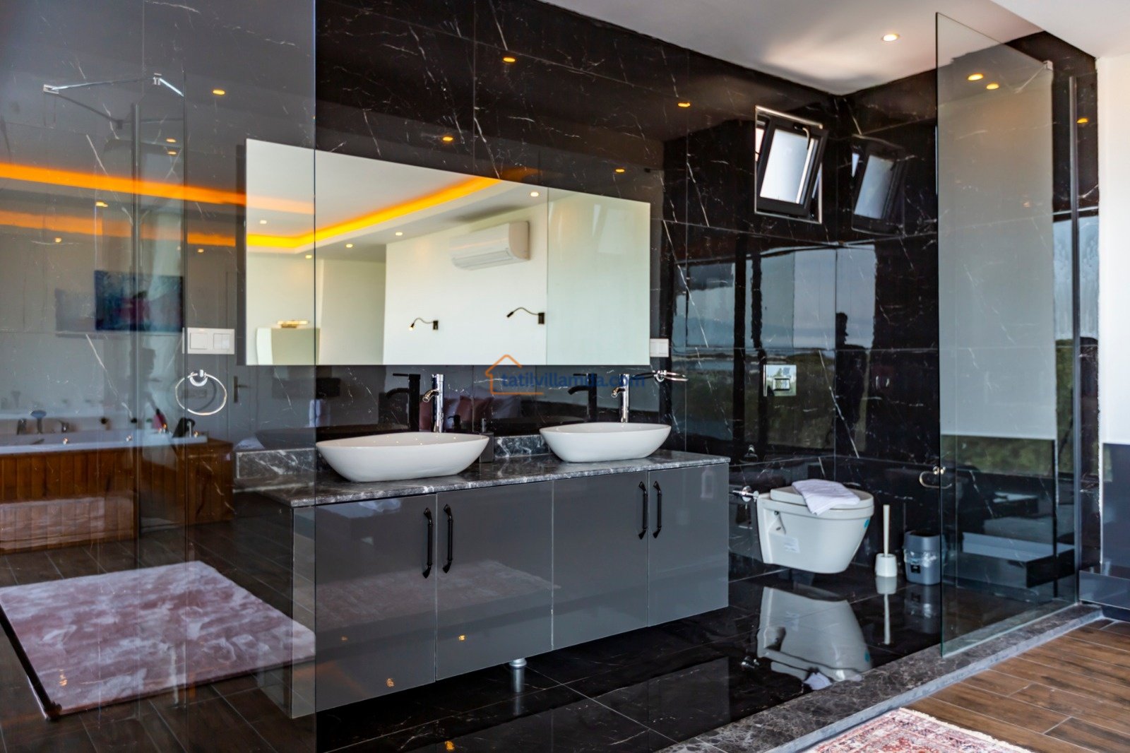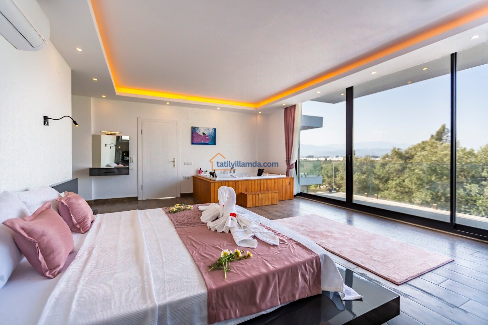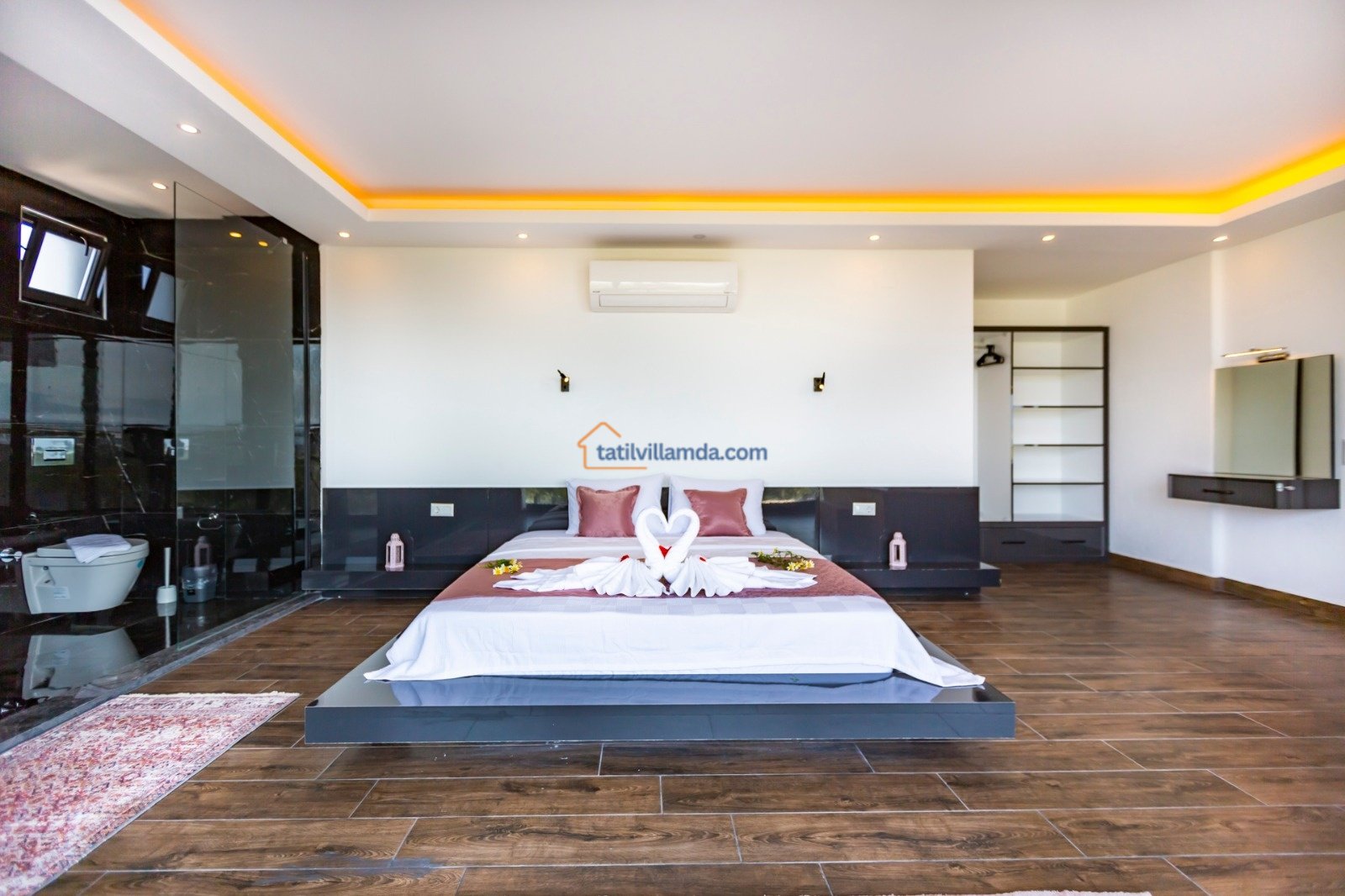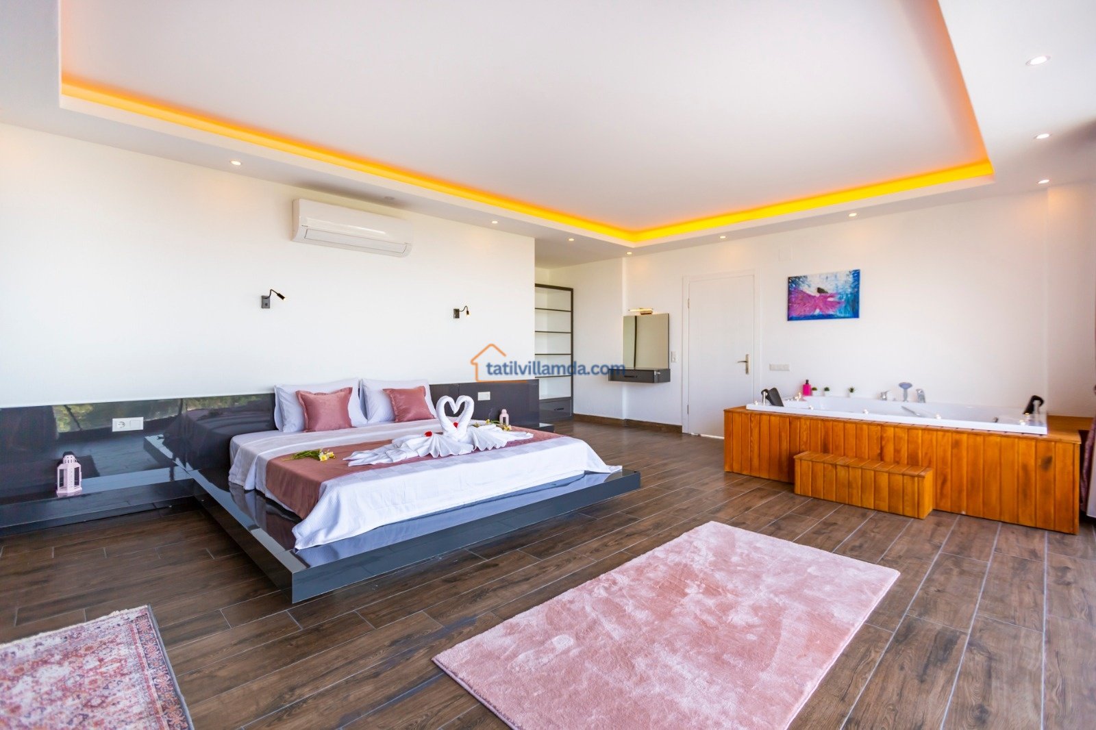 Villa, 2 yatak odasına sahip olup 5 kişiye kadar konaklama kapasitesine sahiptir. Her iki odada da jakuzi bulunması, konforunuzu en üst seviyeye çıkarırken, tatilinize ekstra bir keyif katacaktır. İç mekân, modern ve şık mobilyalarla dizayn edilmiş olup, tatiliniz boyunca ihtiyacınız olan her detay düşünülmüştür.