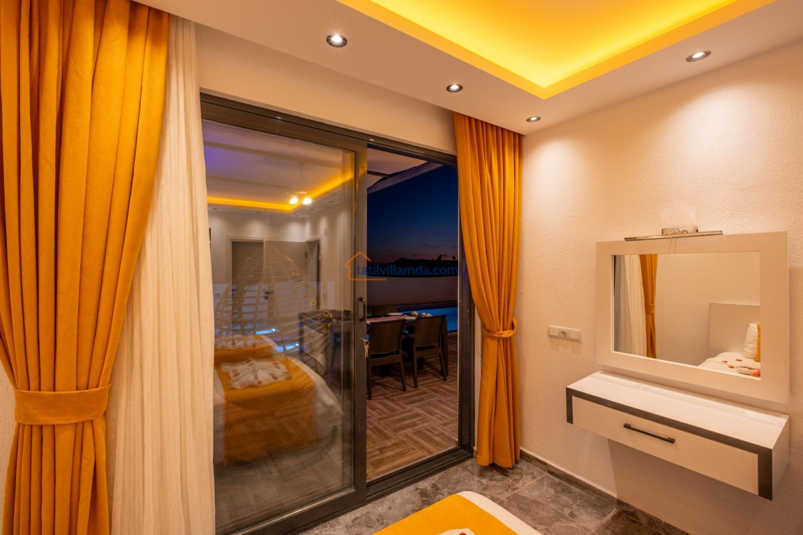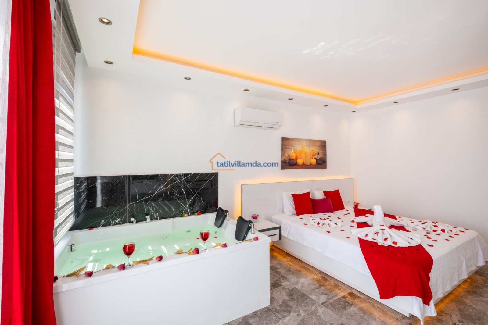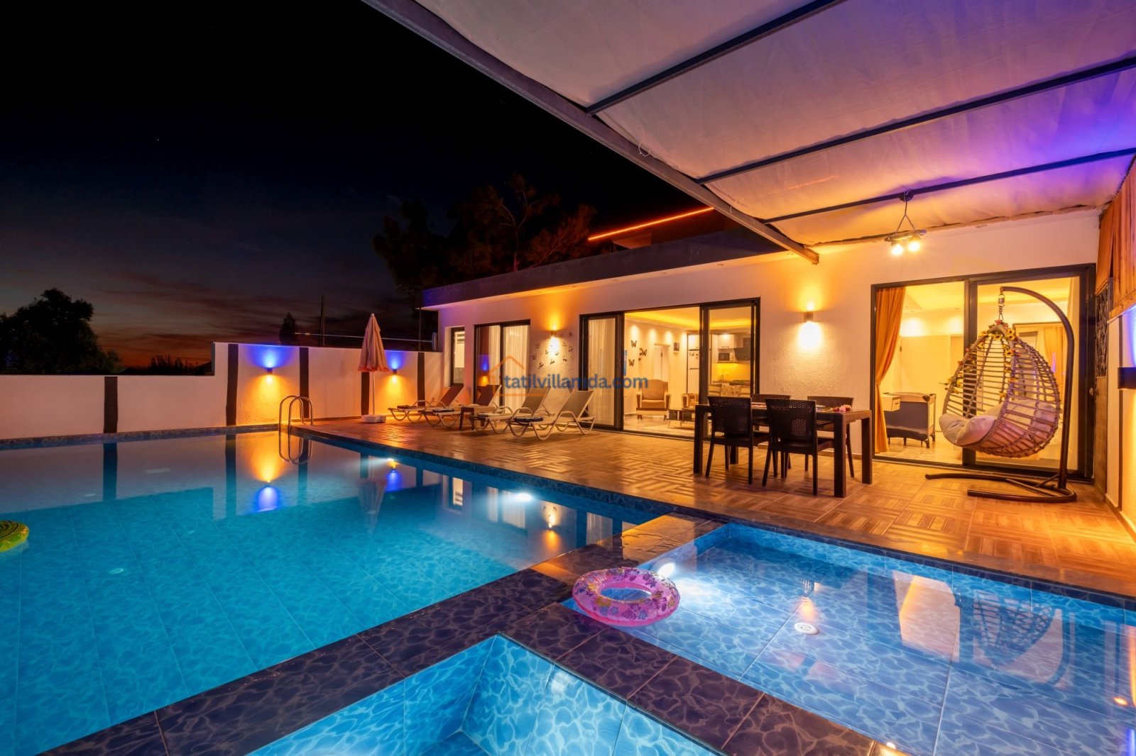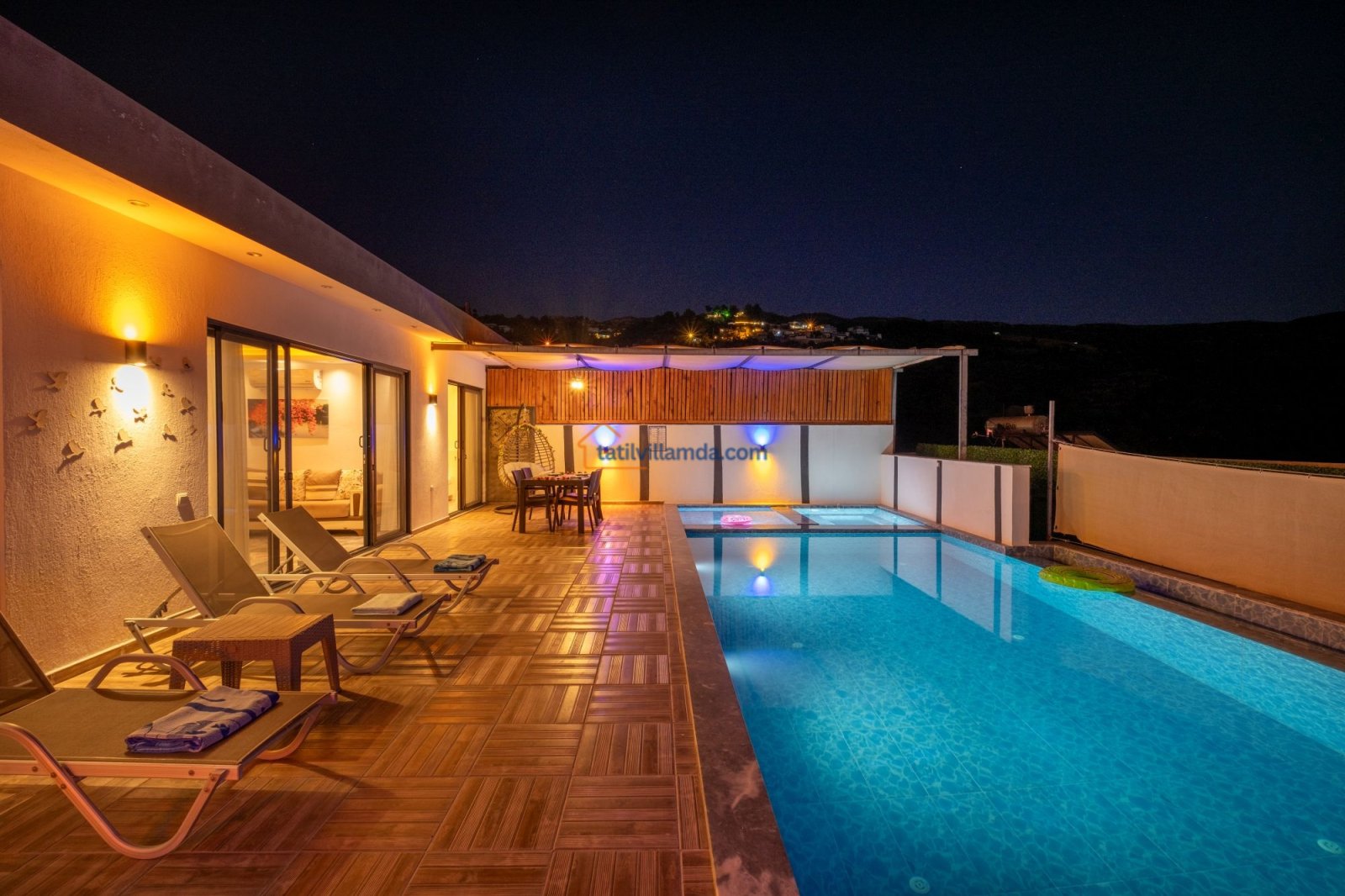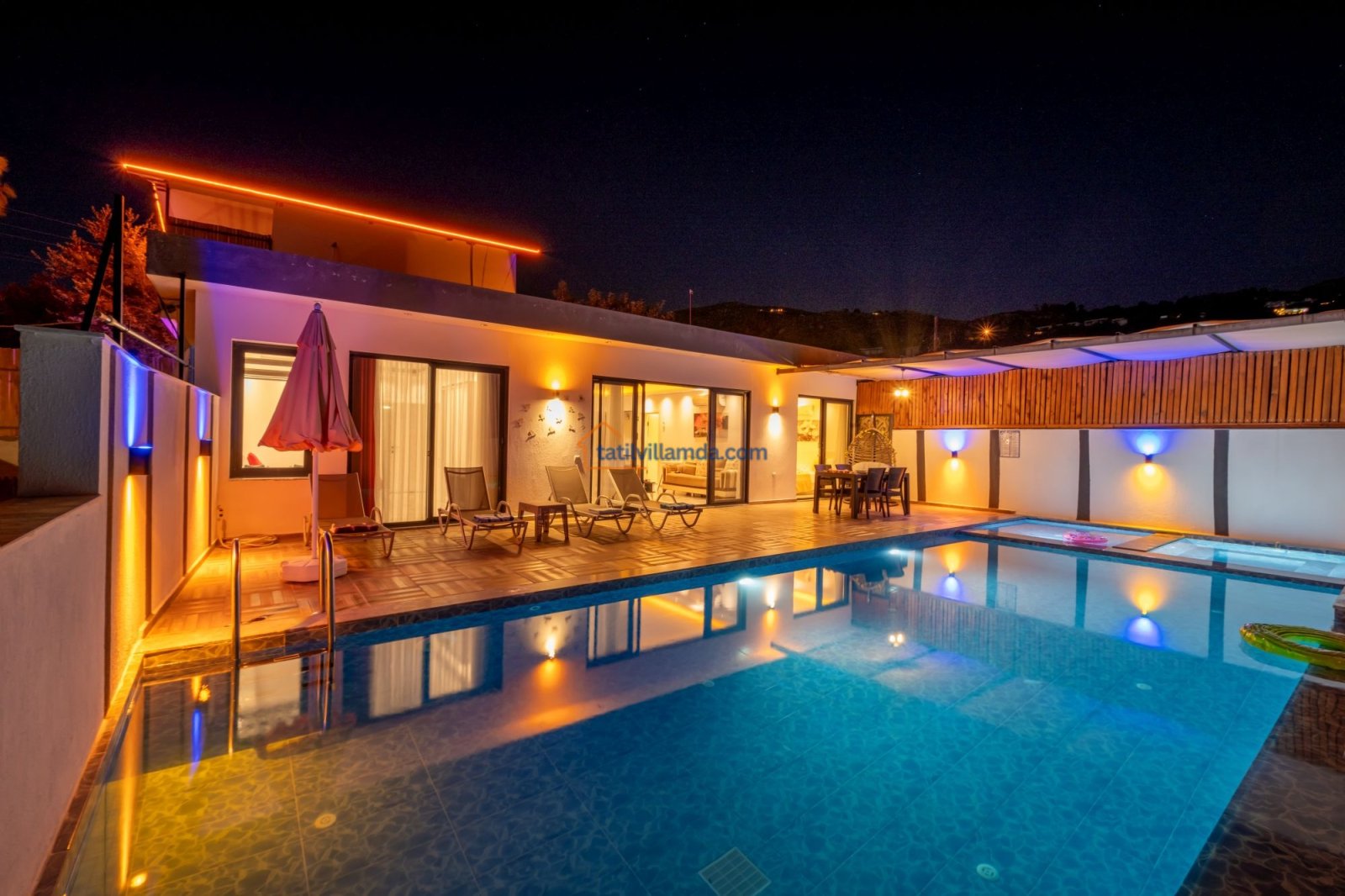 doğa ile iç içe konumu ve konforlu yapısıyla Kalkan’ın gözde bölgelerinden Üzümlü mevkiinde yer almaktadır. Korunaklı ve geniş özel yüzme havuzu sayesinde muhafazakâr aileler ve balayı çiftleri için oldukça ideal bir seçenektir. Ayrıca çocuklar için ayrı bir çocuk havuzu bulunması, aile tatillerini daha güvenli ve keyifli hale getirir. Villamız 2 yatak odalı olup toplam 4 kişi konaklama kapasitesine sahiptir. Yatak odalarından biri ebeveyn banyolu olup jakuzisi ile tatilinize ekstra konfor katar.