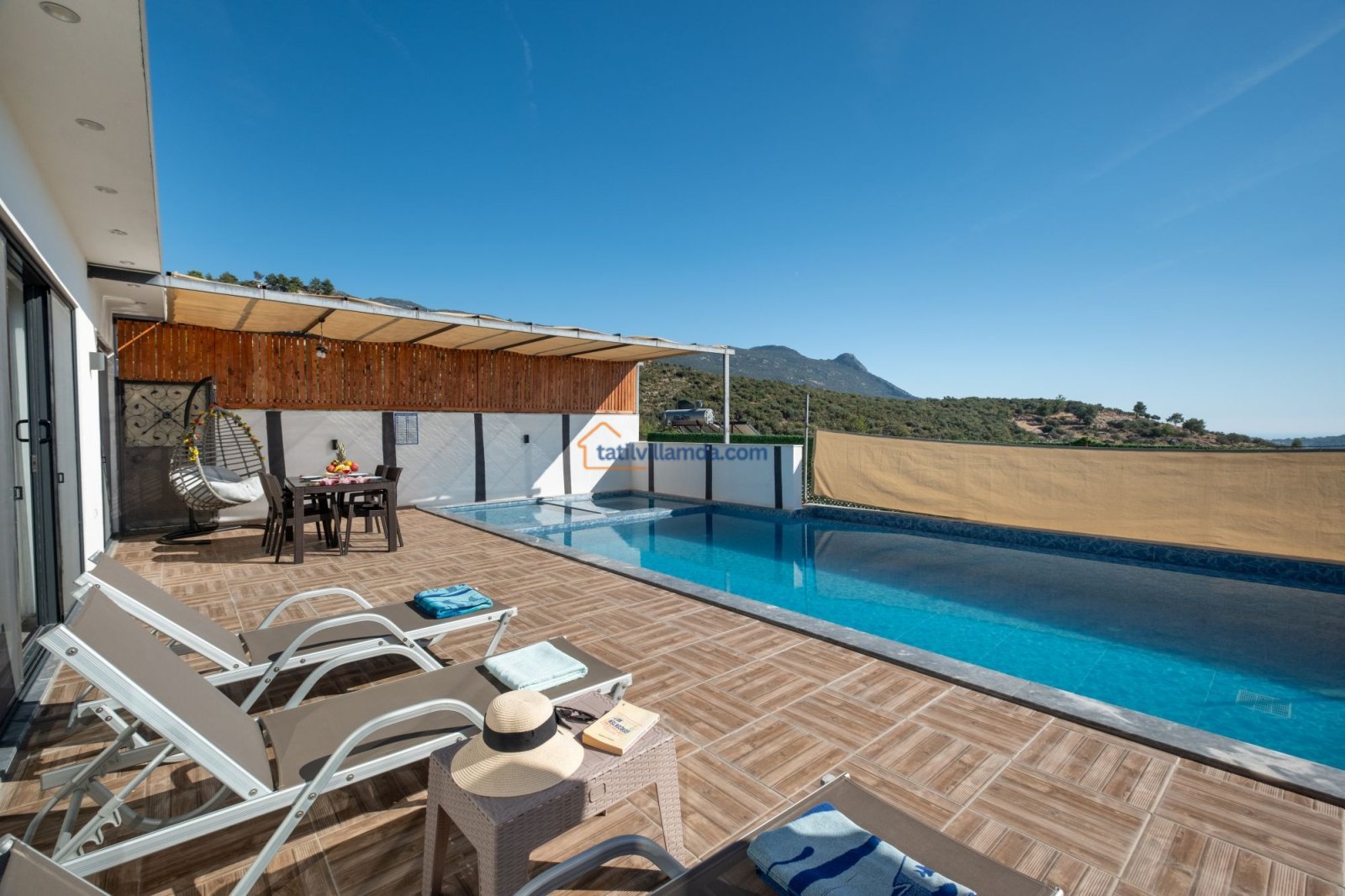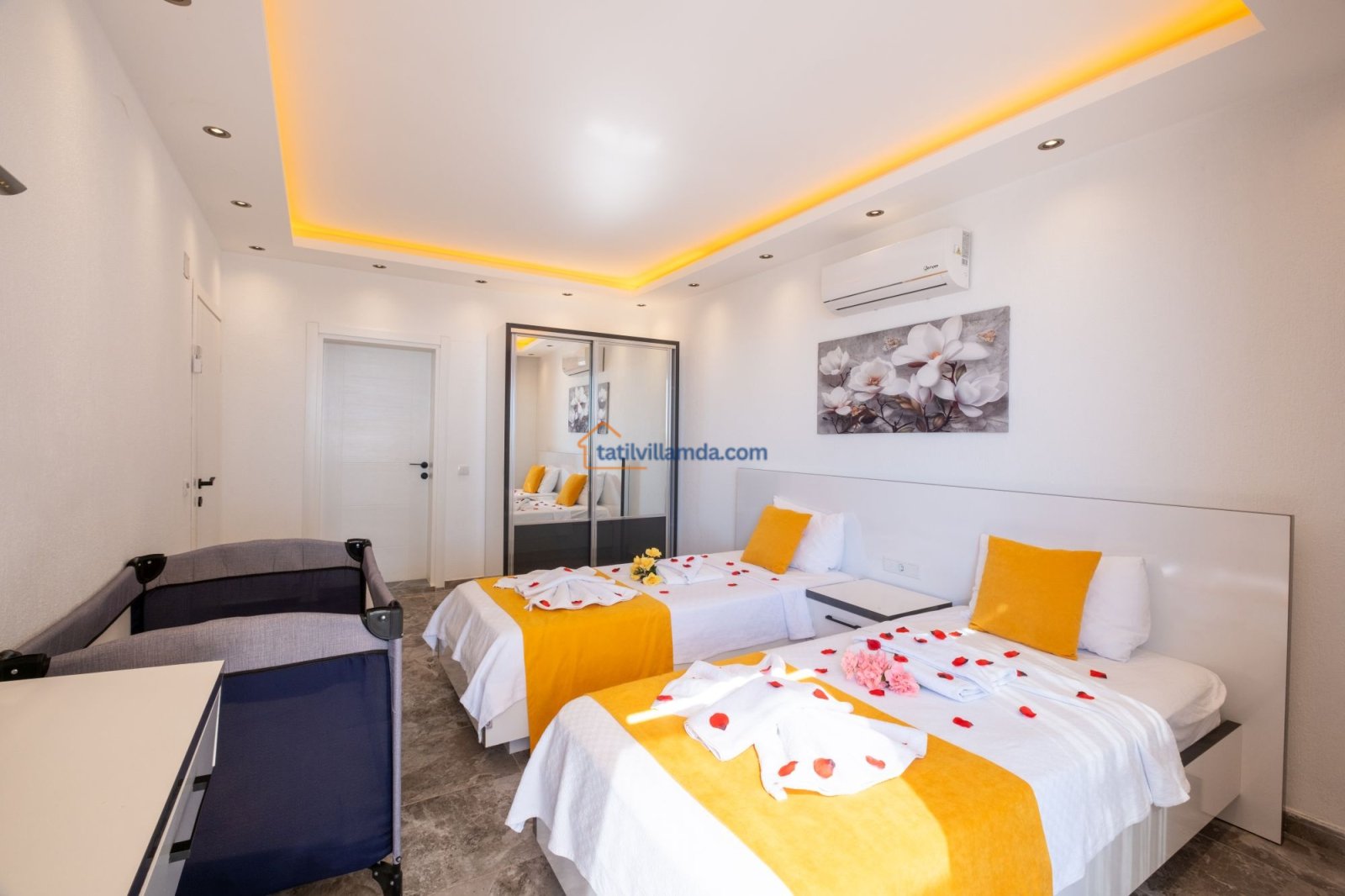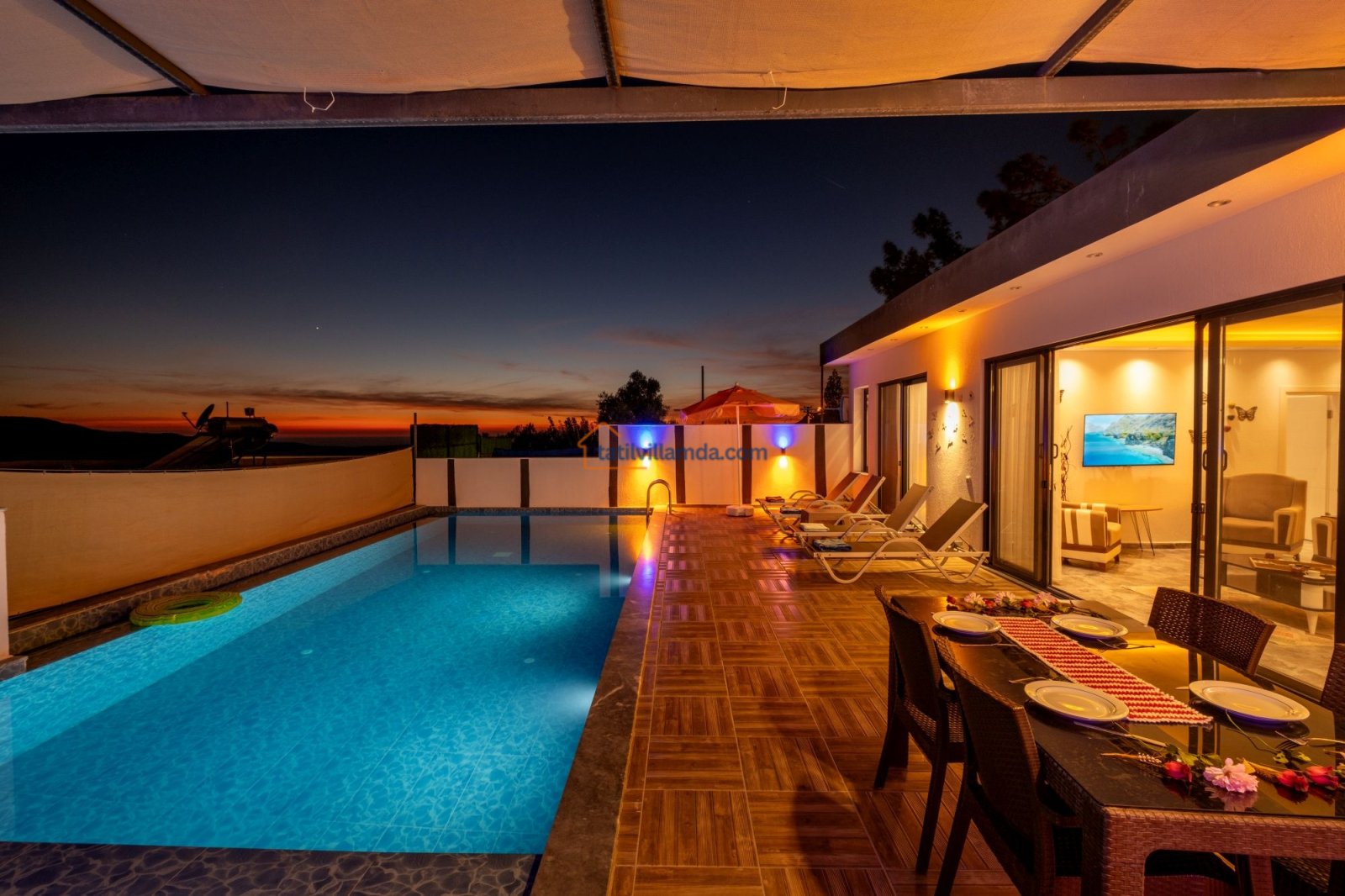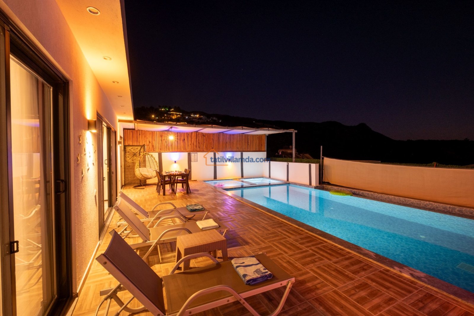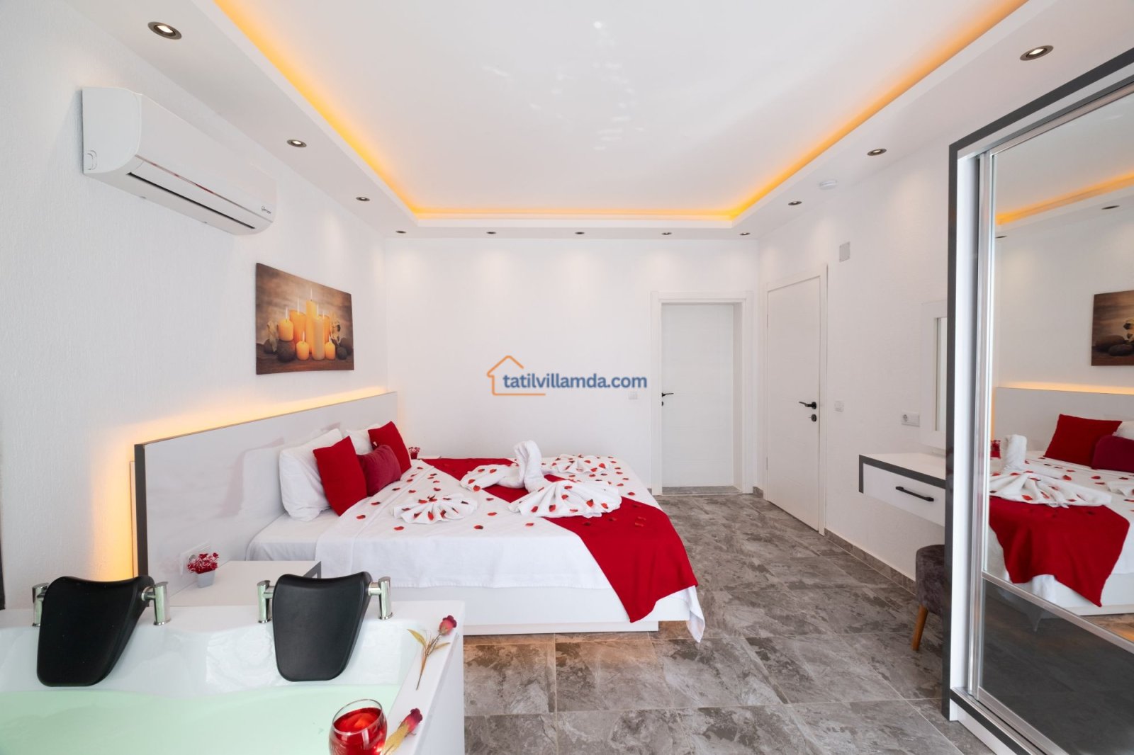 doğa ile iç içe konumu ve konforlu yapısıyla Kalkan’ın gözde bölgelerinden Üzümlü mevkiinde yer almaktadır. Korunaklı ve geniş özel yüzme havuzu sayesinde muhafazakâr aileler ve balayı çiftleri için oldukça ideal bir seçenektir. Ayrıca çocuklar için ayrı bir çocuk havuzu bulunması, aile tatillerini daha güvenli ve keyifli hale getirir. Villamız 2 yatak odalı olup toplam 4 kişi konaklama kapasitesine sahiptir. Yatak odalarından biri ebeveyn banyolu olup jakuzisi ile tatilinize ekstra konfor katar.