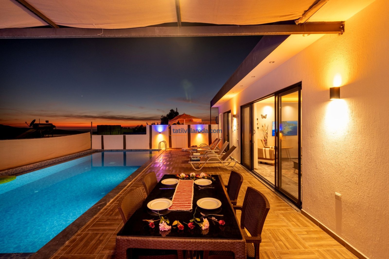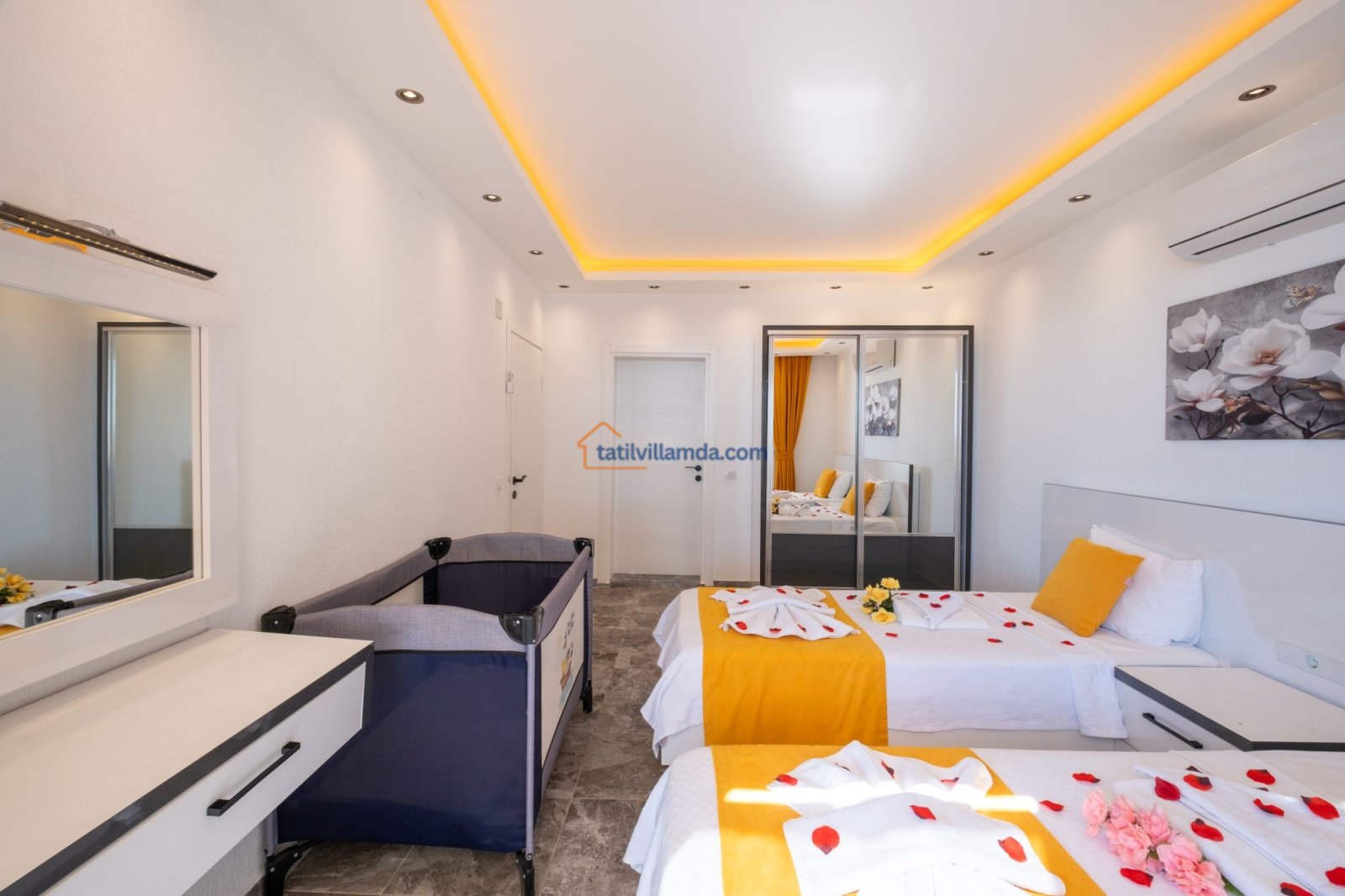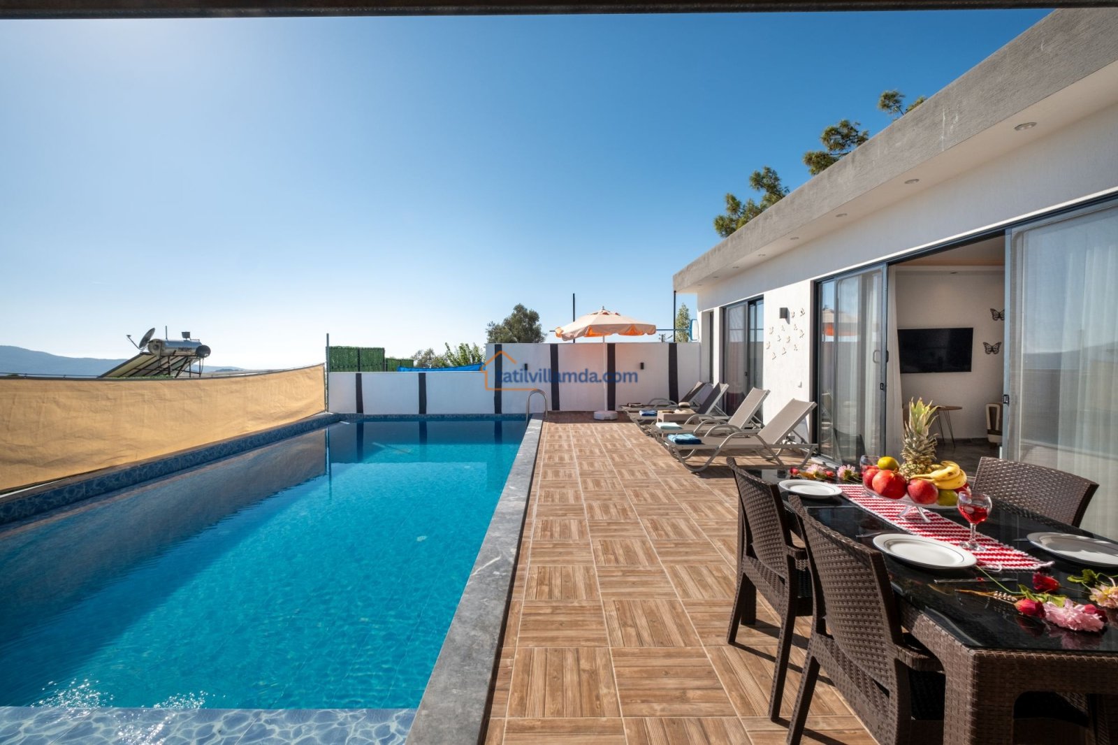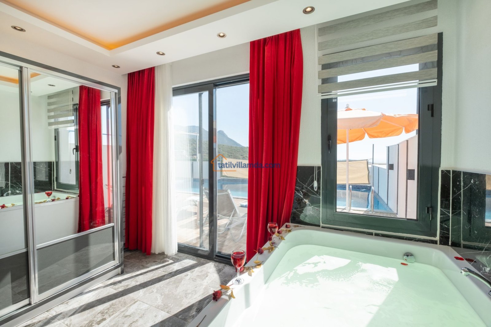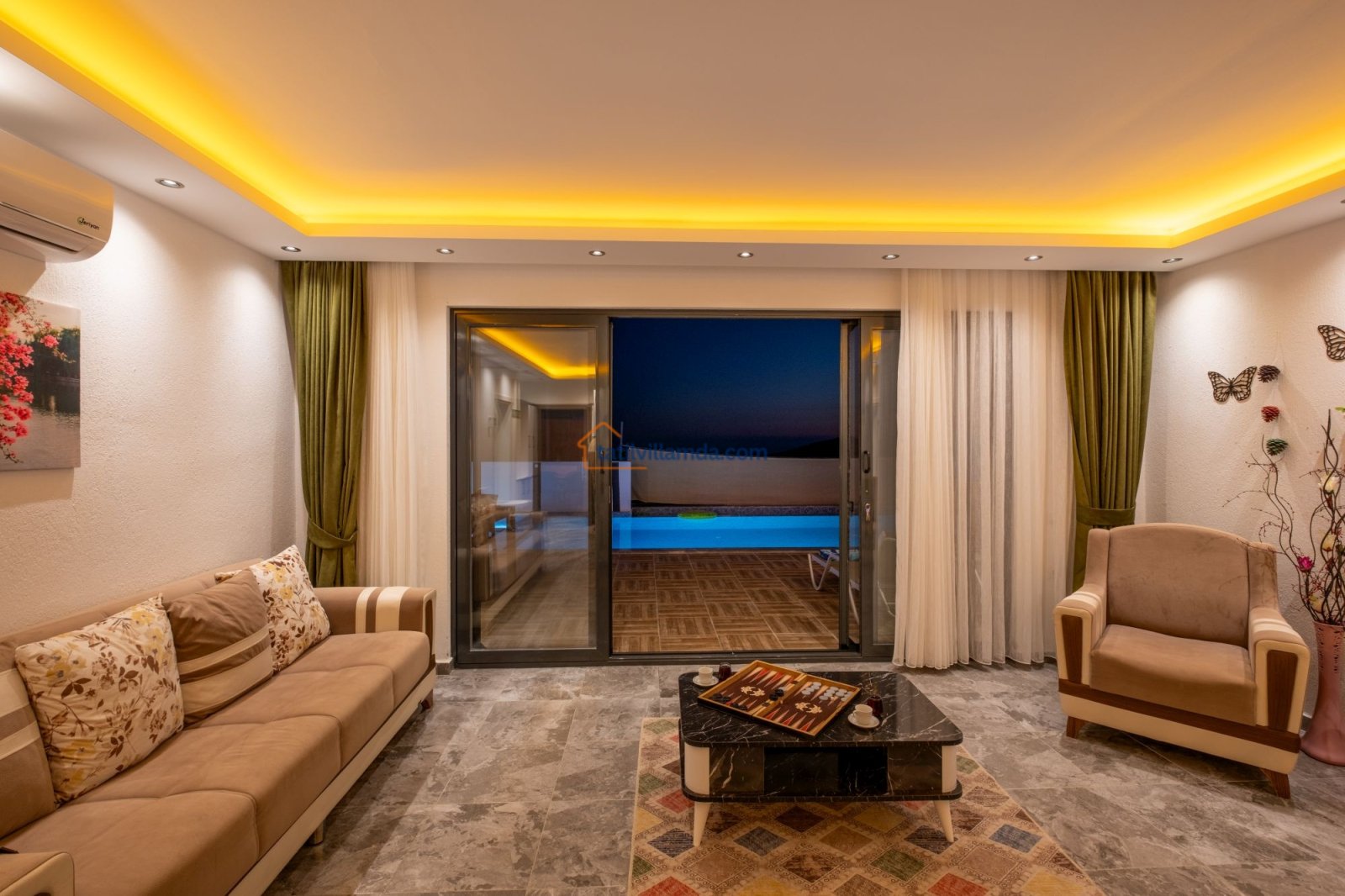 doğa ile iç içe konumu ve konforlu yapısıyla Kalkan’ın gözde bölgelerinden Üzümlü mevkiinde yer almaktadır. Korunaklı ve geniş özel yüzme havuzu sayesinde muhafazakâr aileler ve balayı çiftleri için oldukça ideal bir seçenektir. Ayrıca çocuklar için ayrı bir çocuk havuzu bulunması, aile tatillerini daha güvenli ve keyifli hale getirir. Villamız 2 yatak odalı olup toplam 4 kişi konaklama kapasitesine sahiptir. Yatak odalarından biri ebeveyn banyolu olup jakuzisi ile tatilinize ekstra konfor katar.