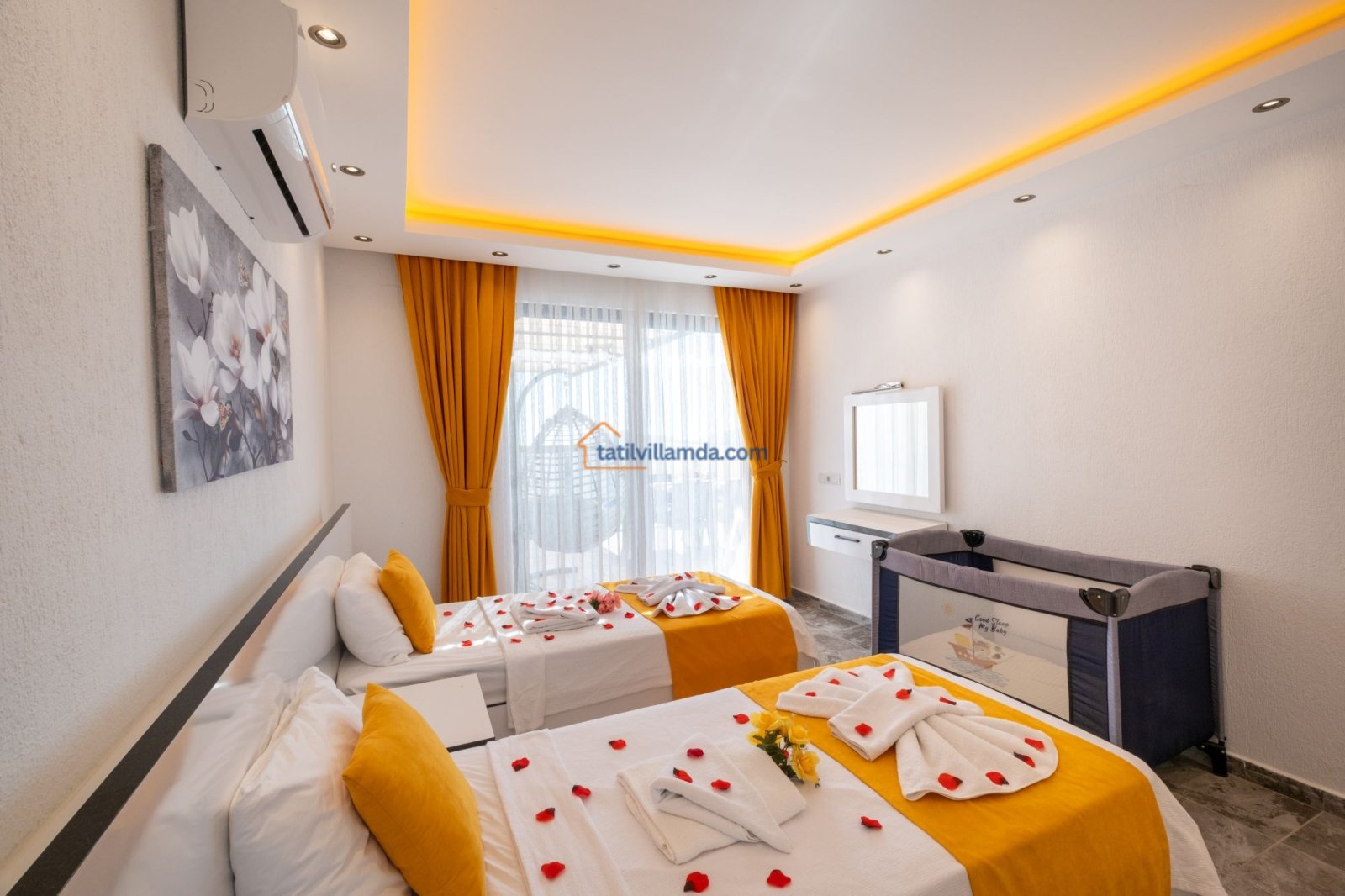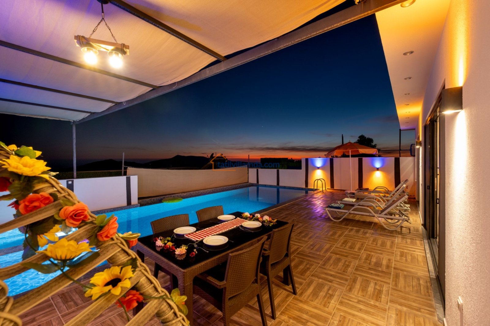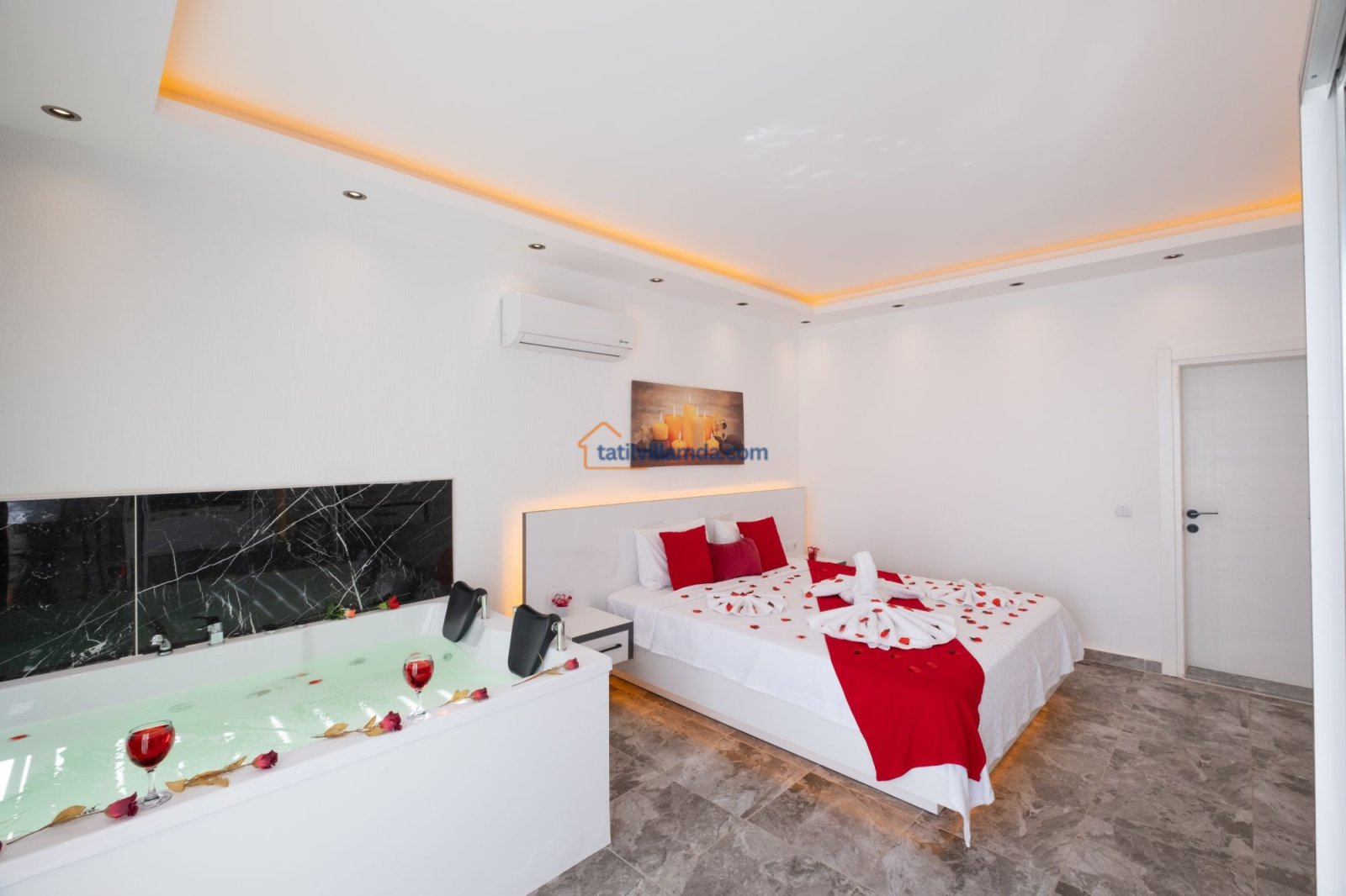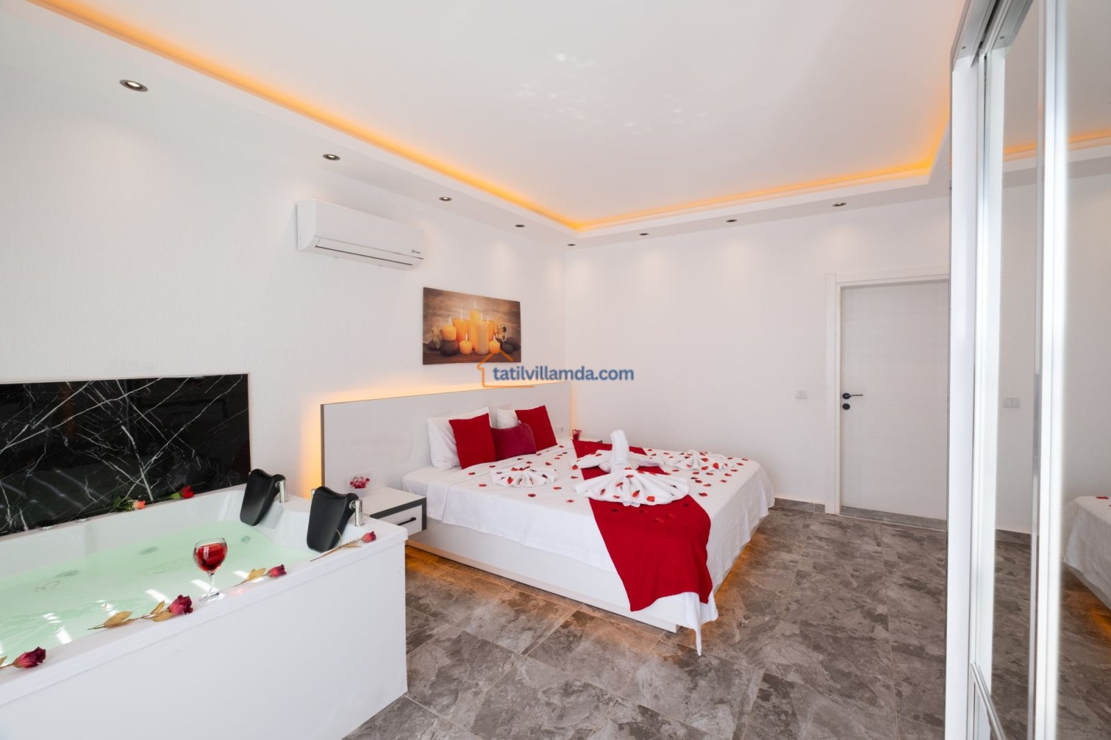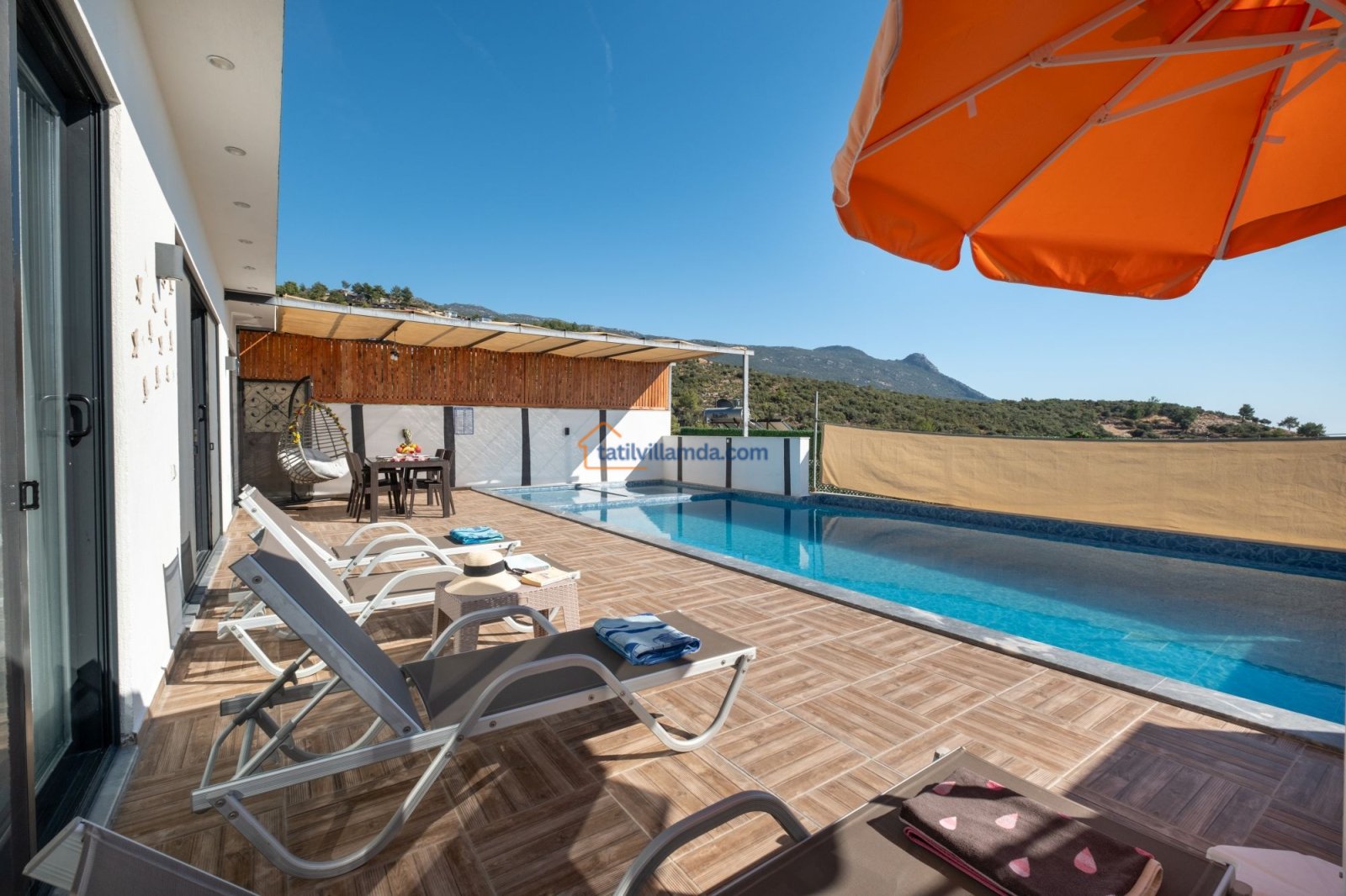 doğa ile iç içe konumu ve konforlu yapısıyla Kalkan’ın gözde bölgelerinden Üzümlü mevkiinde yer almaktadır. Korunaklı ve geniş özel yüzme havuzu sayesinde muhafazakâr aileler ve balayı çiftleri için oldukça ideal bir seçenektir. Ayrıca çocuklar için ayrı bir çocuk havuzu bulunması, aile tatillerini daha güvenli ve keyifli hale getirir. Villamız 2 yatak odalı olup toplam 4 kişi konaklama kapasitesine sahiptir. Yatak odalarından biri ebeveyn banyolu olup jakuzisi ile tatilinize ekstra konfor katar.