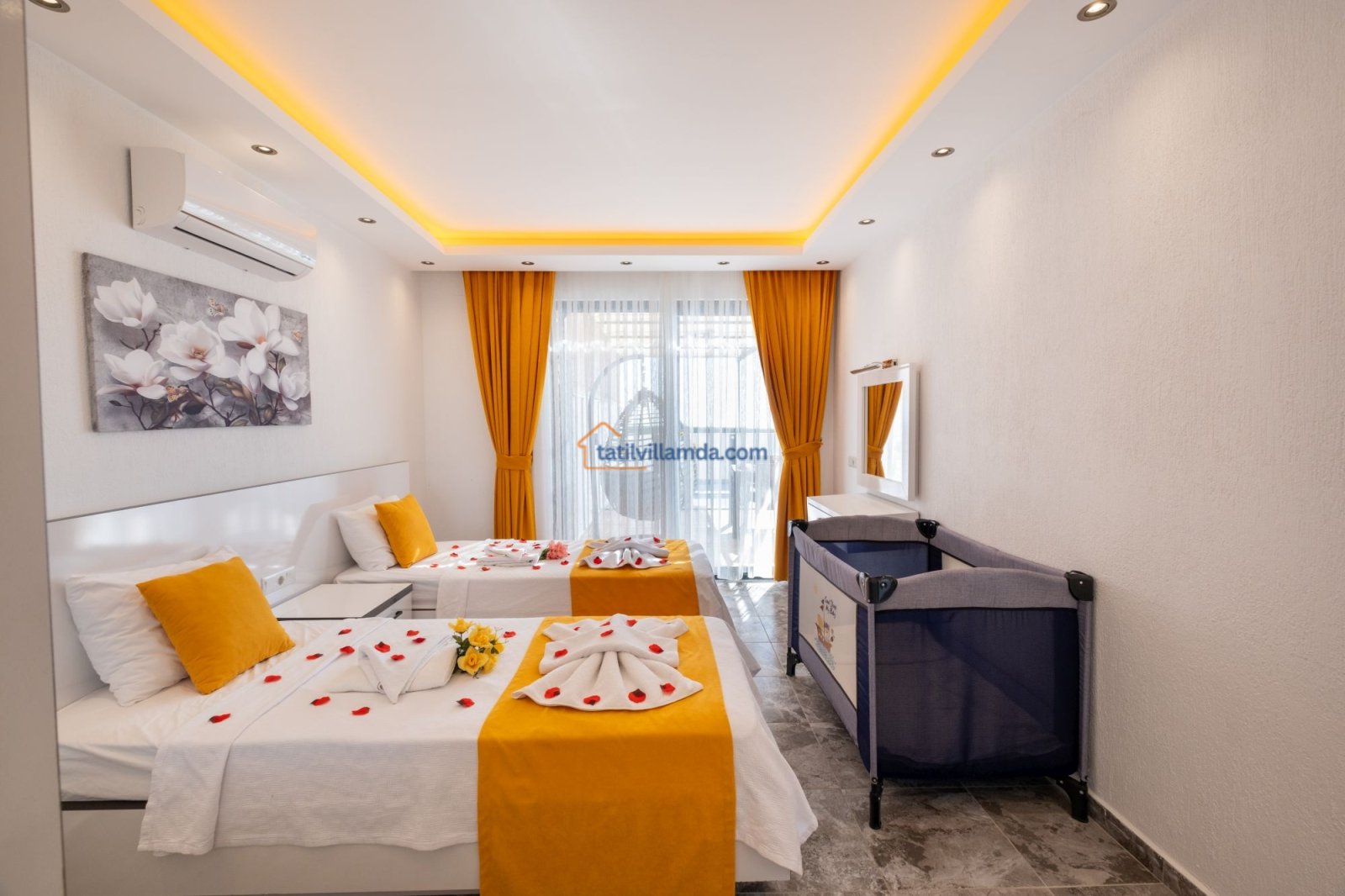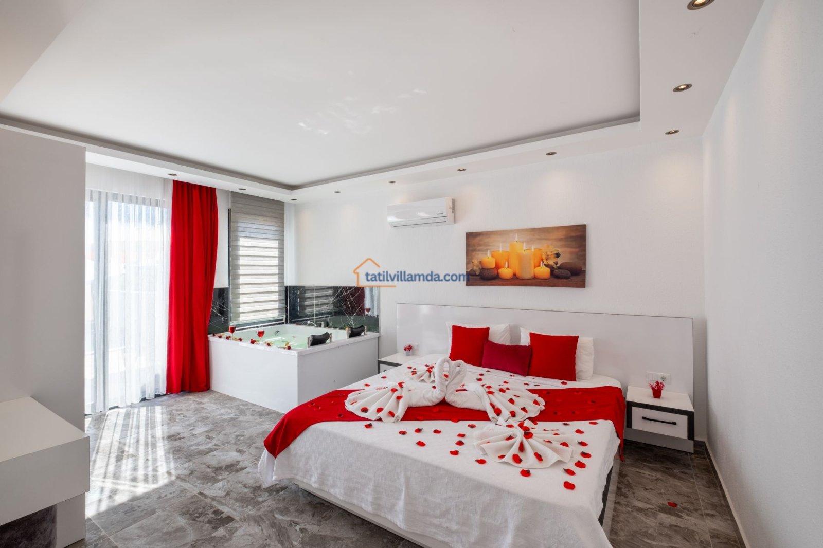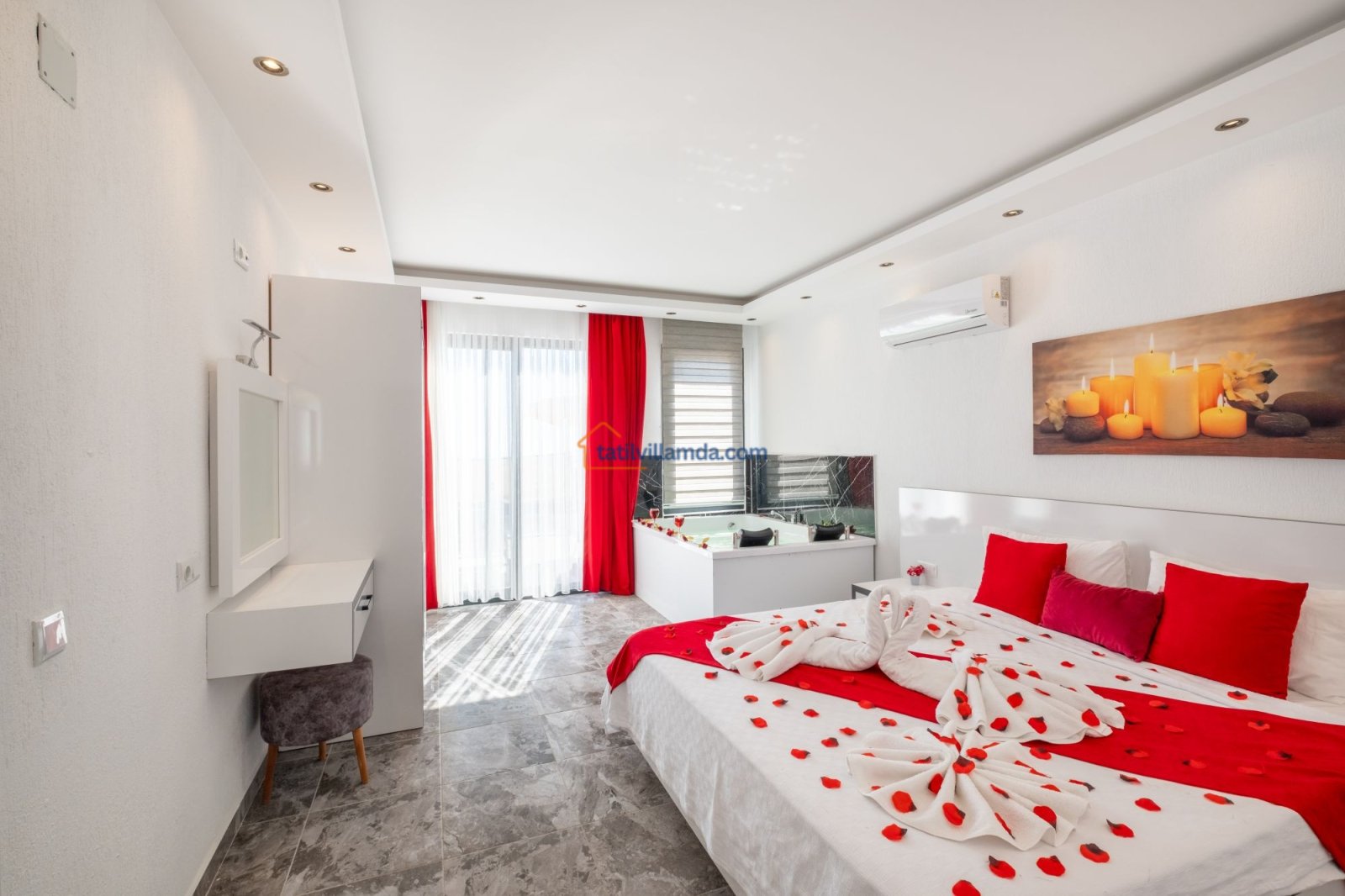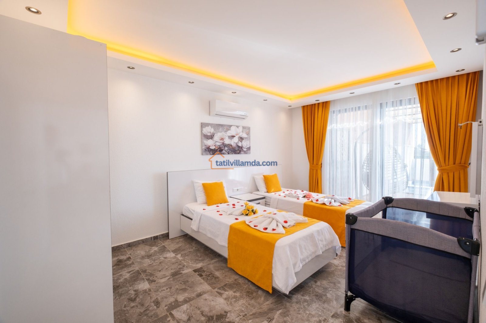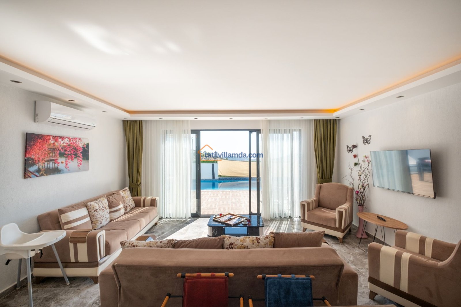 doğa ile iç içe konumu ve konforlu yapısıyla Kalkan’ın gözde bölgelerinden Üzümlü mevkiinde yer almaktadır. Korunaklı ve geniş özel yüzme havuzu sayesinde muhafazakâr aileler ve balayı çiftleri için oldukça ideal bir seçenektir. Ayrıca çocuklar için ayrı bir çocuk havuzu bulunması, aile tatillerini daha güvenli ve keyifli hale getirir. Villamız 2 yatak odalı olup toplam 4 kişi konaklama kapasitesine sahiptir. Yatak odalarından biri ebeveyn banyolu olup jakuzisi ile tatilinize ekstra konfor katar.