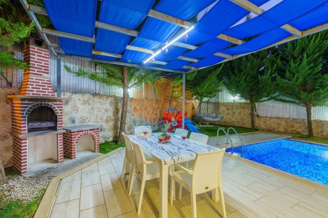 Geniş havuz terası tatil keyfinizi dış mekâna taşır. Havuz başında şezlong, şemsiye ve bahçe oturma grubu yer alırken; salıncak alanı dinlenmek isteyen misafirler için hoş bir köşe sunar. Barbekü alanı ve masa takımı sayesinde akşam yemeklerinizi açık havada, keyifli sofralar eşliğinde değerlendirebilirsiniz. Ayrıca masa tenisi ile eğlenceli vakit geçirebilir, mini çocuk oyun parkı sayesinde küçük misafirlerinizin de güvenle eğlenmesini sağlayabilirsiniz.