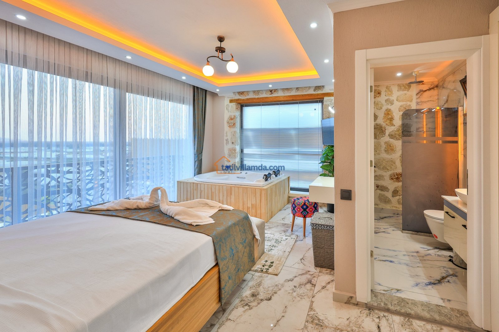 Villa, 2 yatak odasına sahip olup toplamda 4 kişilik konaklama kapasitesine sahiptir. Her iki yatak odasında da jakuzi bulunur, böylece tatilinize ekstra konfor katabilirsiniz. Çocuklu aileler için düşünülmüş çocuk havuzu, mini oyun alanı ve trambolin sayesinde küçük misafirler de keyifli vakit geçirebilir.