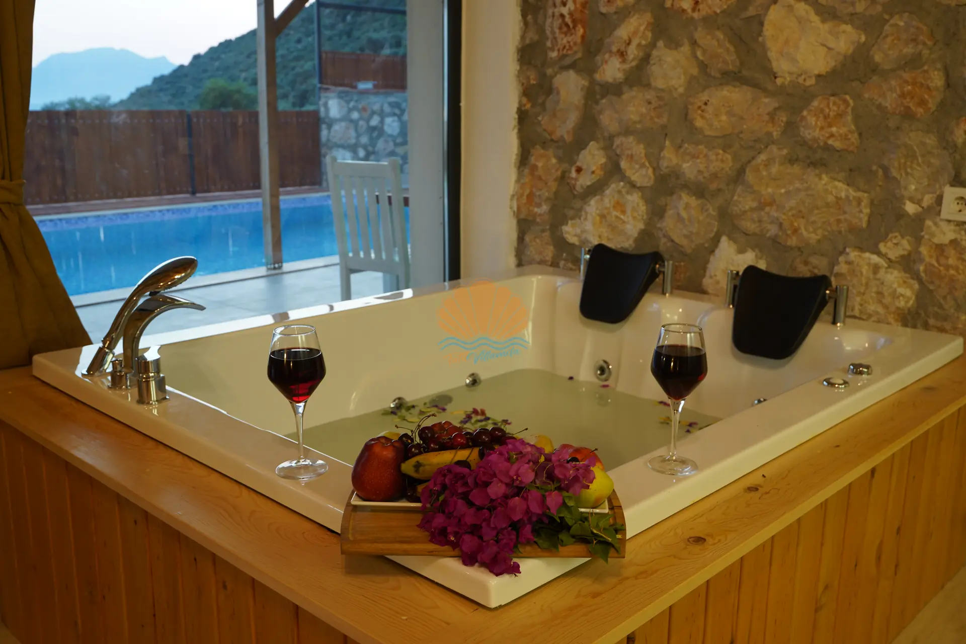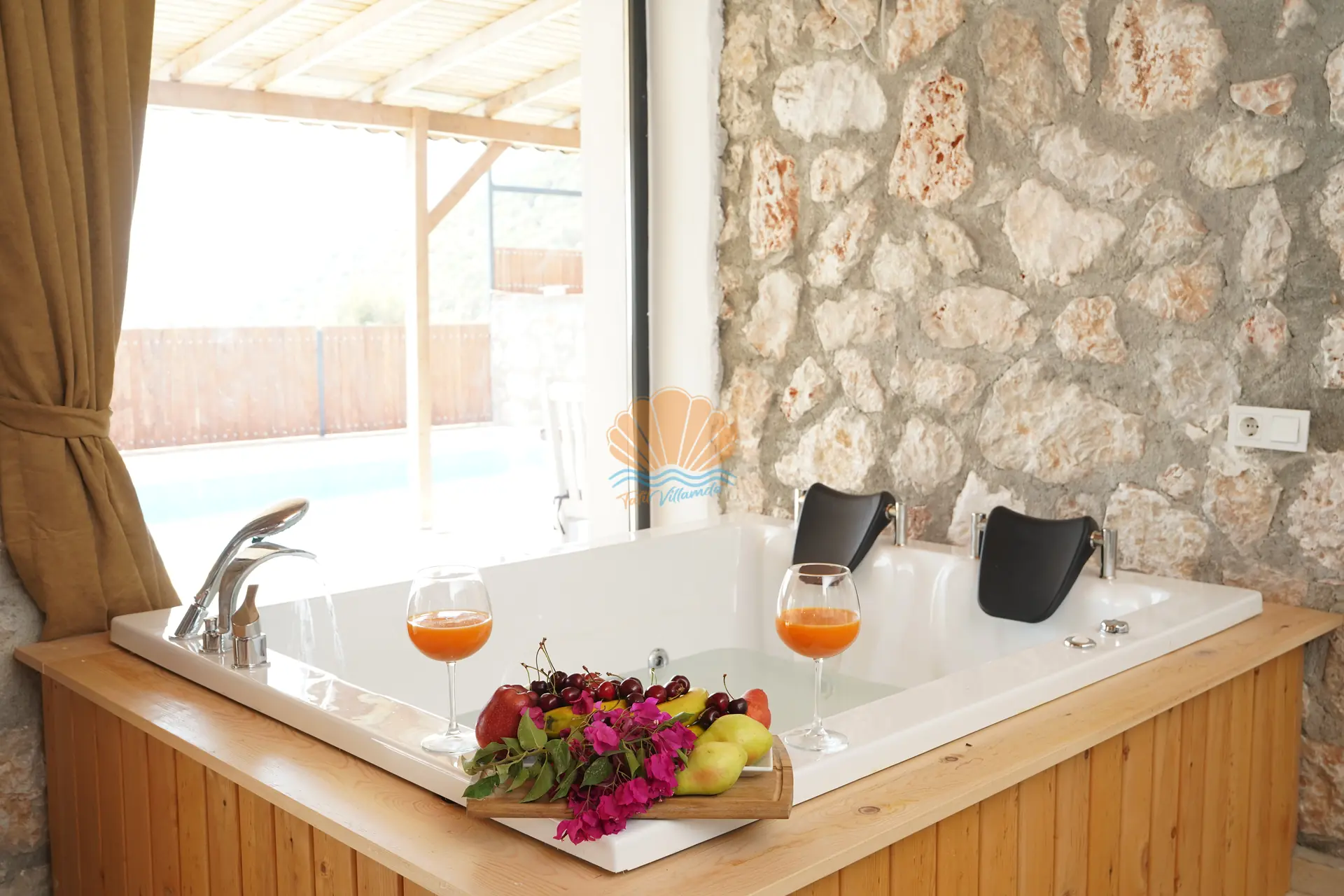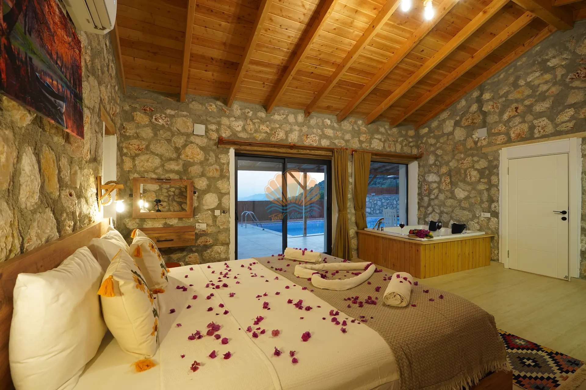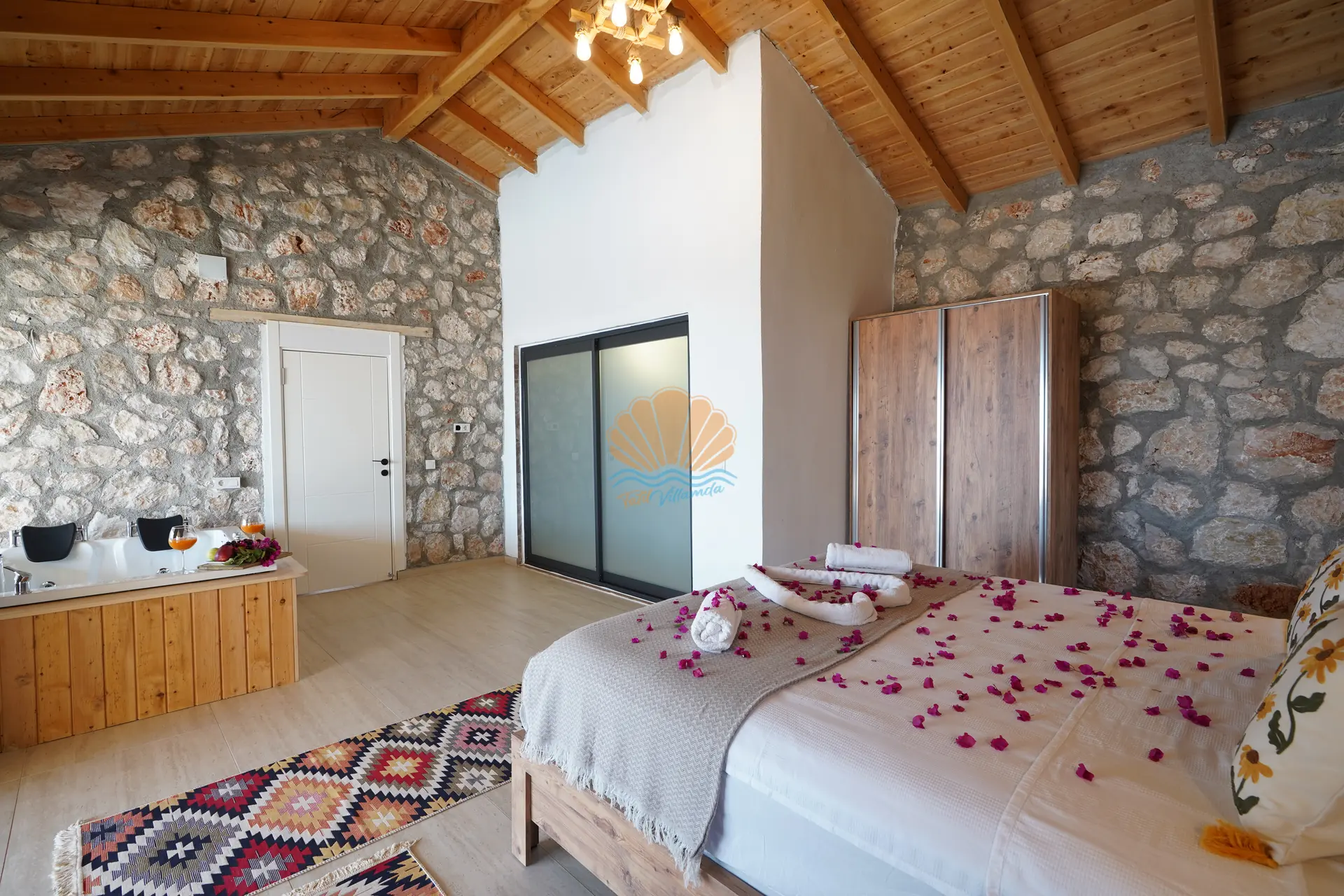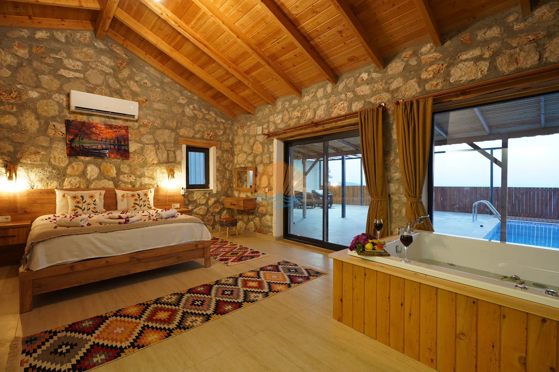 2 yatak odasına sahip olan villa, toplamda 4 kişilik konaklama kapasitesine sahiptir. Odaların tamamı ebeveyn banyolu olup misafirlere maksimum konfor ve mahremiyet sunar. Ayrıca villada yer alan jakuzi, günün yorgunluğunu atmak ve rahatlamak isteyen misafirler için keyifli bir ayrıcalık sağlamaktadır. İç dekorasyonda modern ve şık detaylar tercih edilmiş olup, ihtiyaç duyulabilecek tüm ekipmanlar eksiksiz şekilde sunulmuştur.