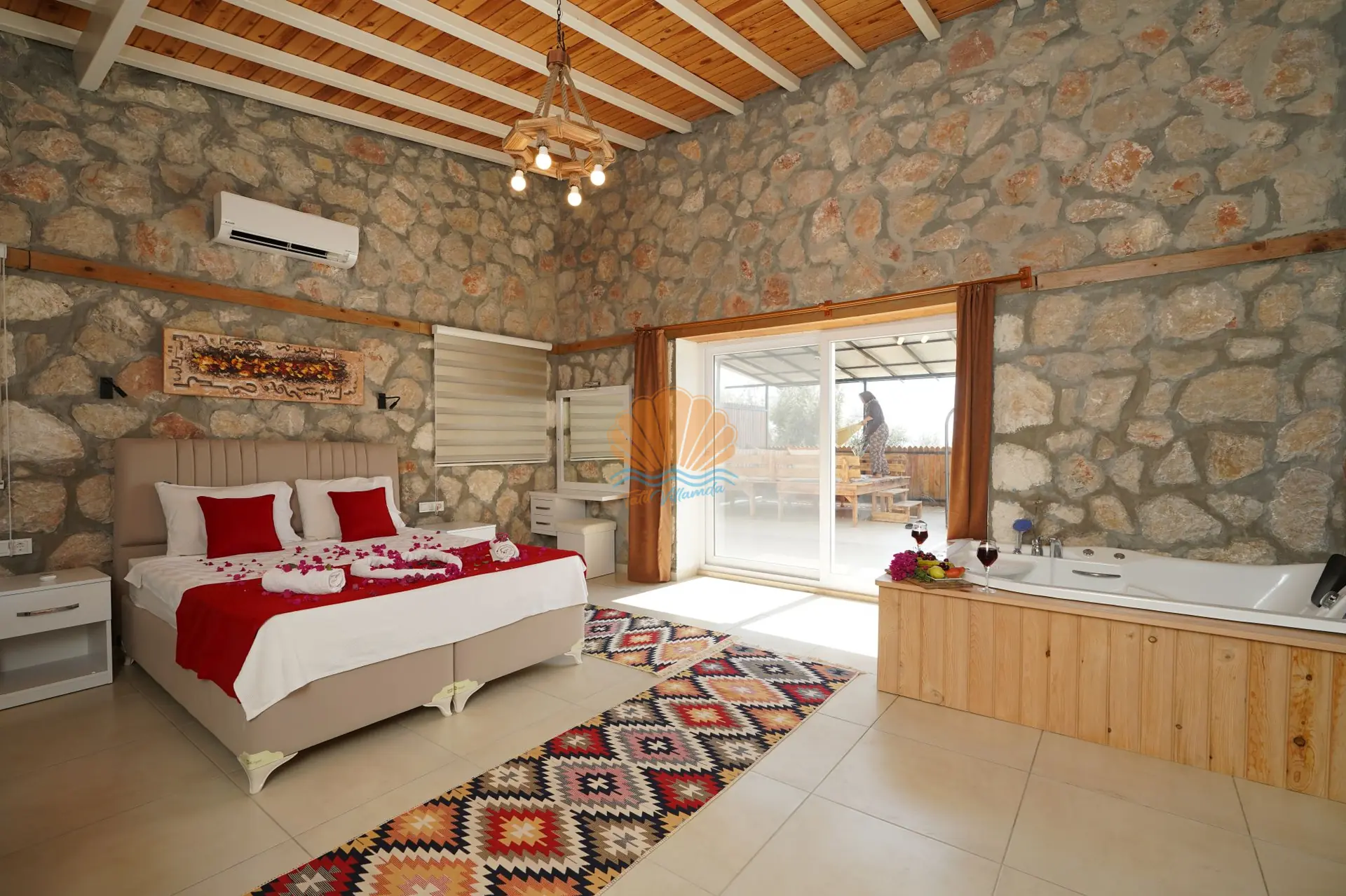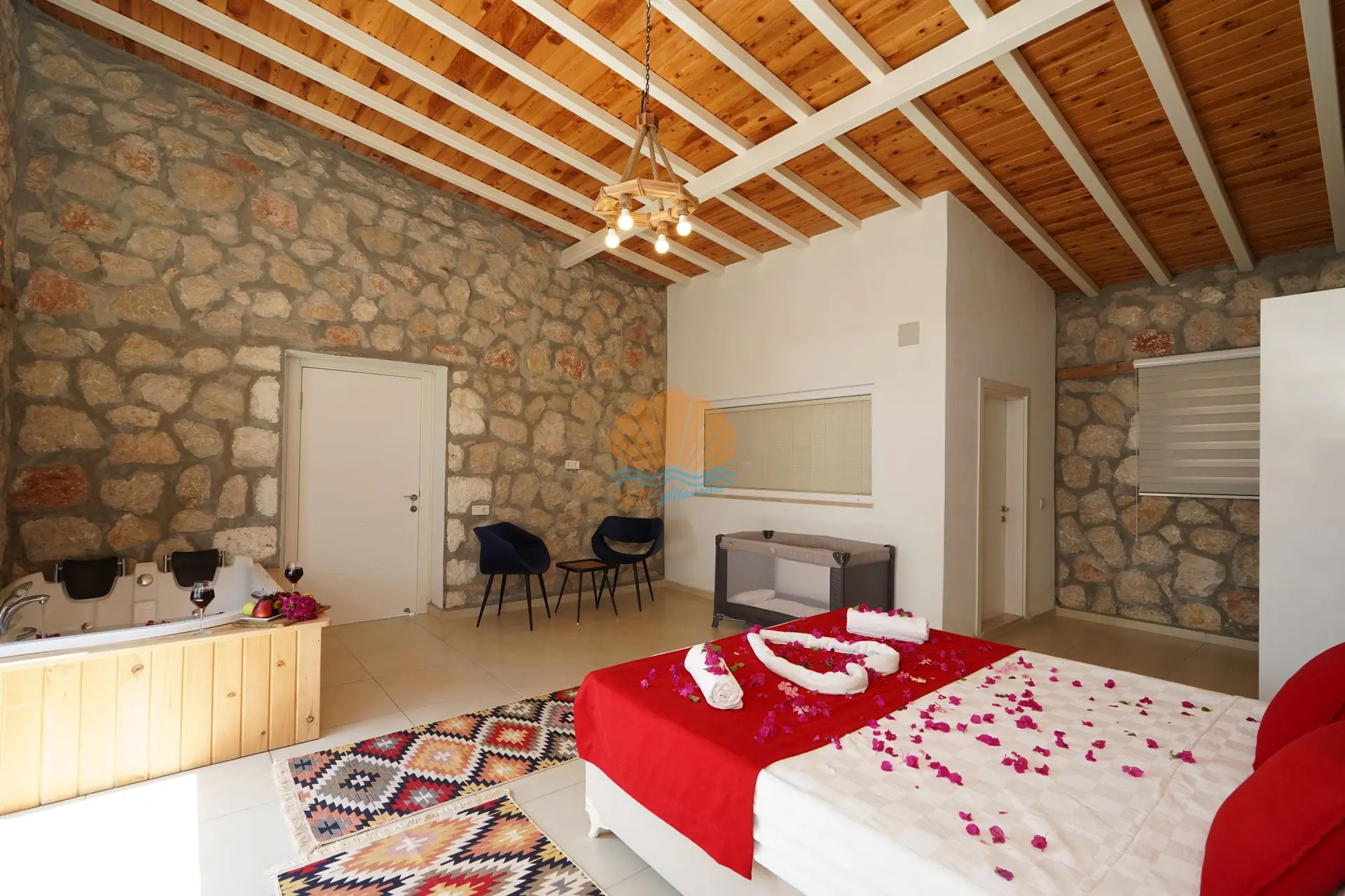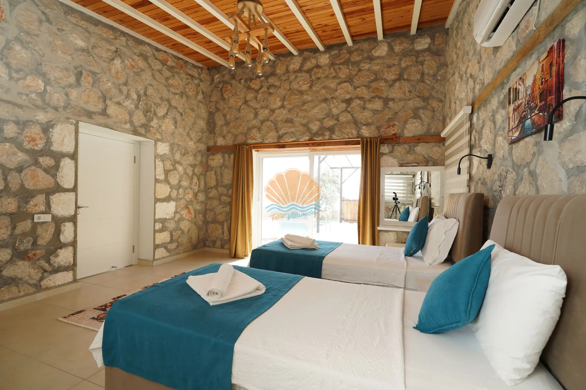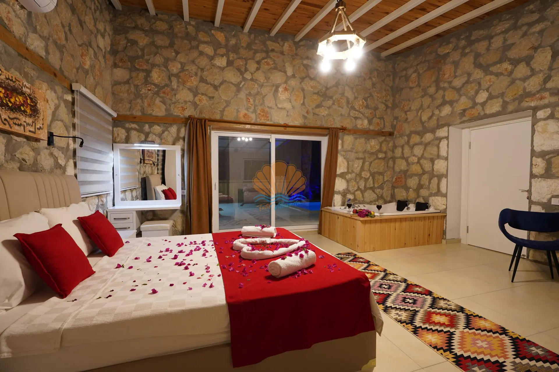 2 yatak odasına sahip olan villa, toplamda 4 kişilik konaklama kapasitesine sahiptir. Odaların tamamı ebeveyn banyolu olup misafirlere maksimum konfor ve mahremiyet sunar. Ayrıca villada yer alan jakuzi, günün yorgunluğunu atmak ve rahatlamak isteyen misafirler için keyifli bir ayrıcalık sağlamaktadır. İç dekorasyonda modern ve şık detaylar tercih edilmiş olup, ihtiyaç duyulabilecek tüm ekipmanlar eksiksiz şekilde sunulmuştur.