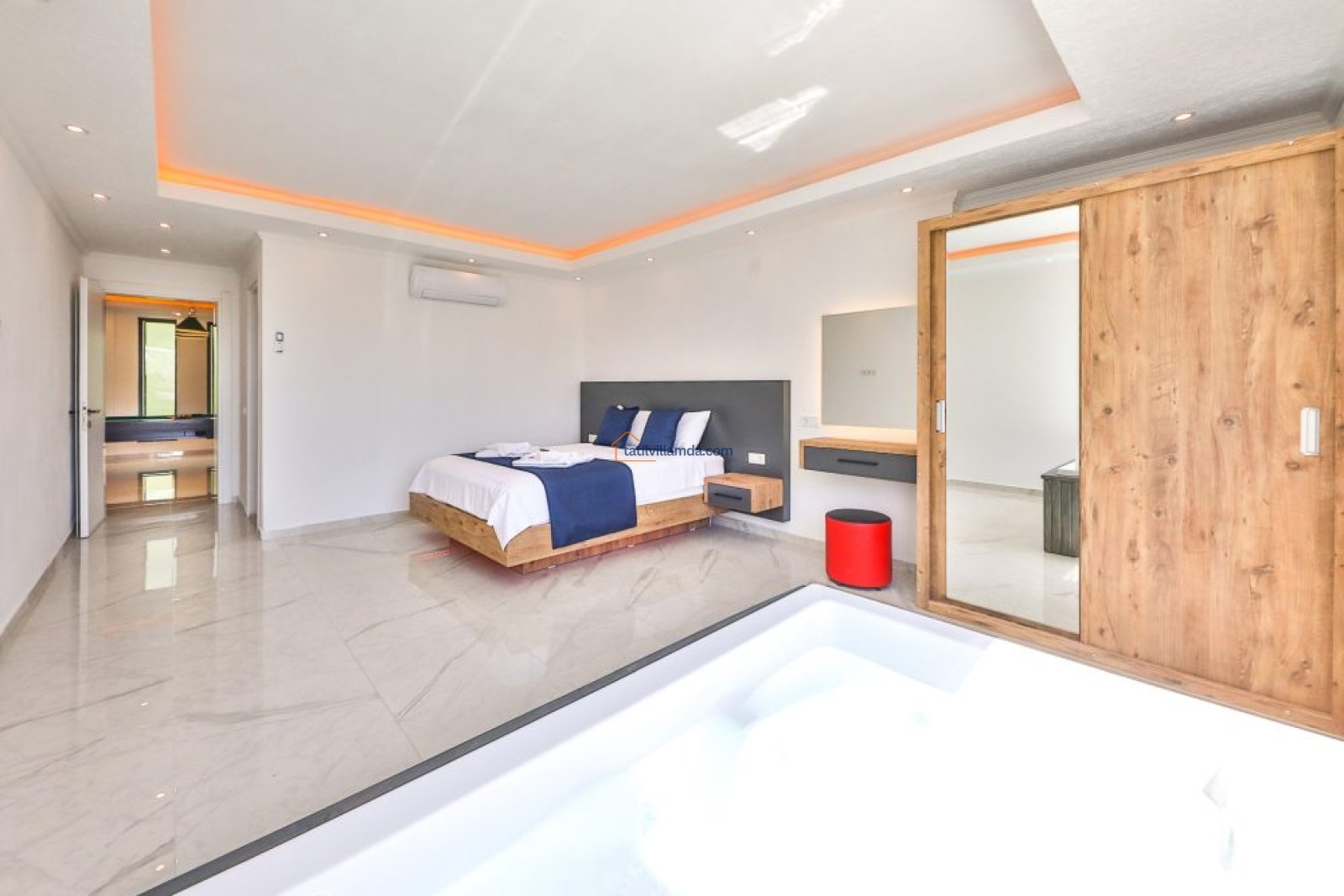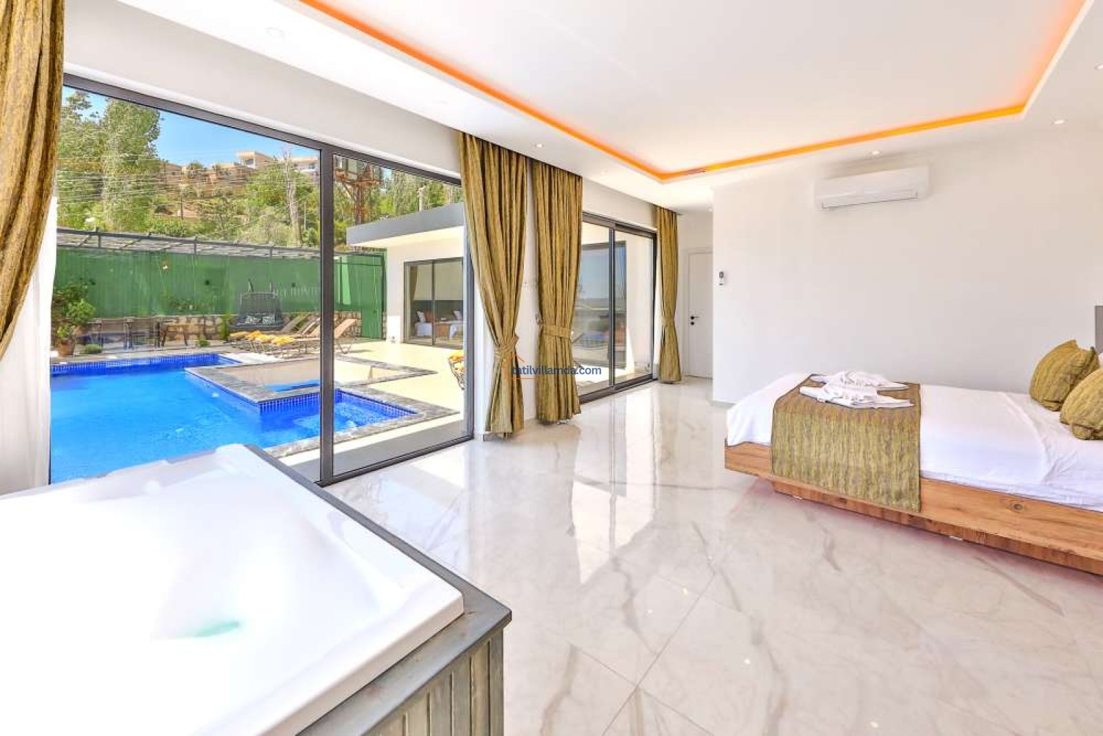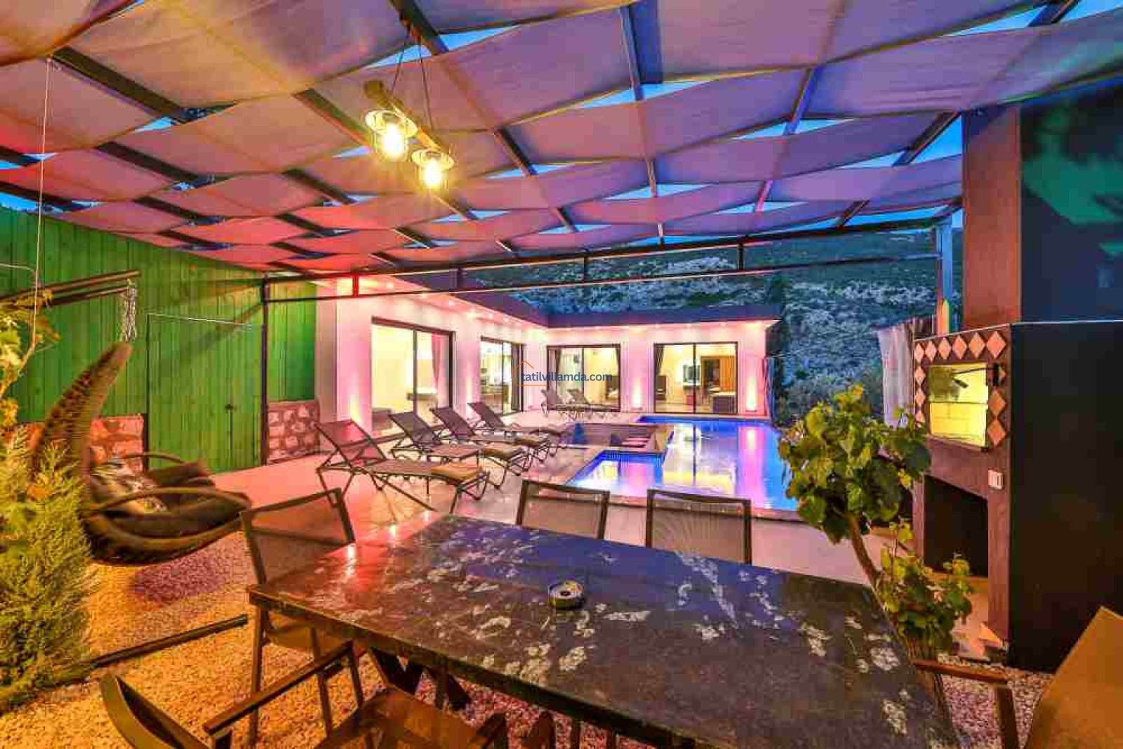 Villanın geniş ve korunaklı özel havuzu, dışarıdan görünmeyecek şekilde tasarlanmış olup, muhafazakâr tatil yapmak isteyen misafirler için uygundur. Ayrıca, tatilinize ekstra konfor katacak jakuzi de bulunmaktadır. Eğlenceli vakit geçirmek isteyenler için villada bilardo masası da mevcuttur.