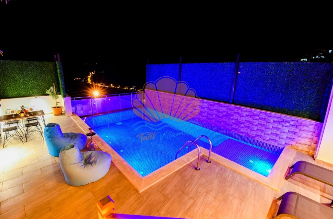 Havuz terasında şezlonglar, şemsiye, barbekü ve yemek masası yer almaktadır. Gün içerisinde serinlemek için özel havuzunuzu kullanabilir, akşam saatlerinde ise barbekü keyfi yaparak romantik anlar yaşayabilirsiniz. Korunaklı yapısı sayesinde dışarıdan görünmeyen havuz alanı, size tamamen özel bir yaşam alanı sunar.