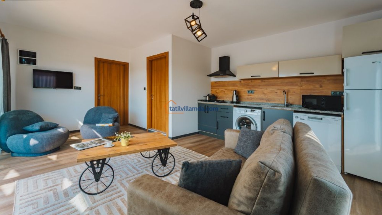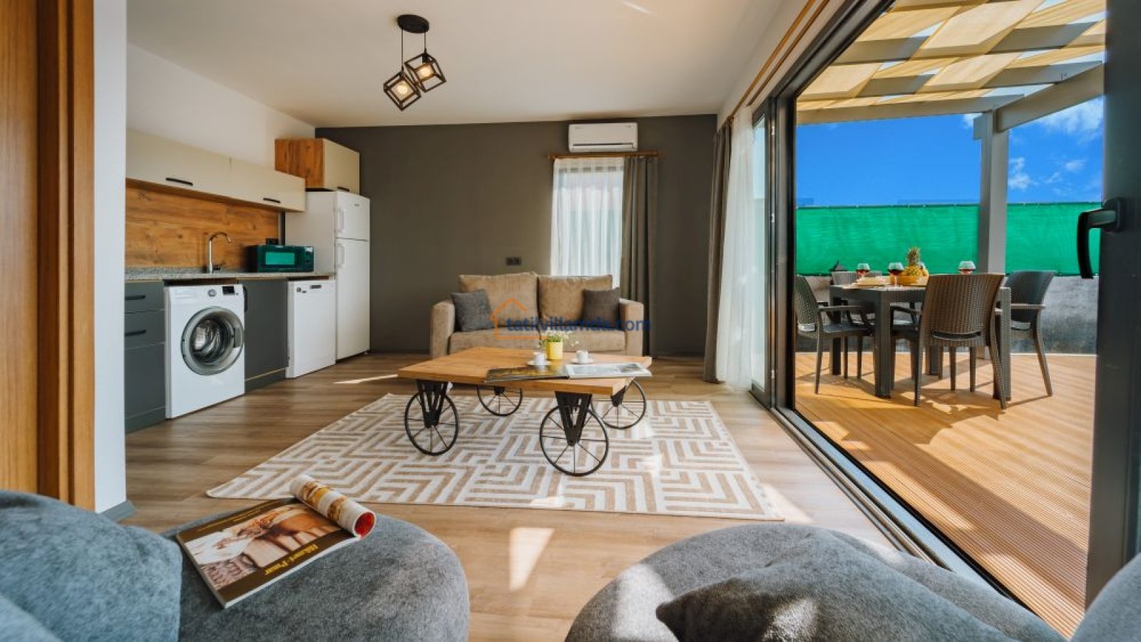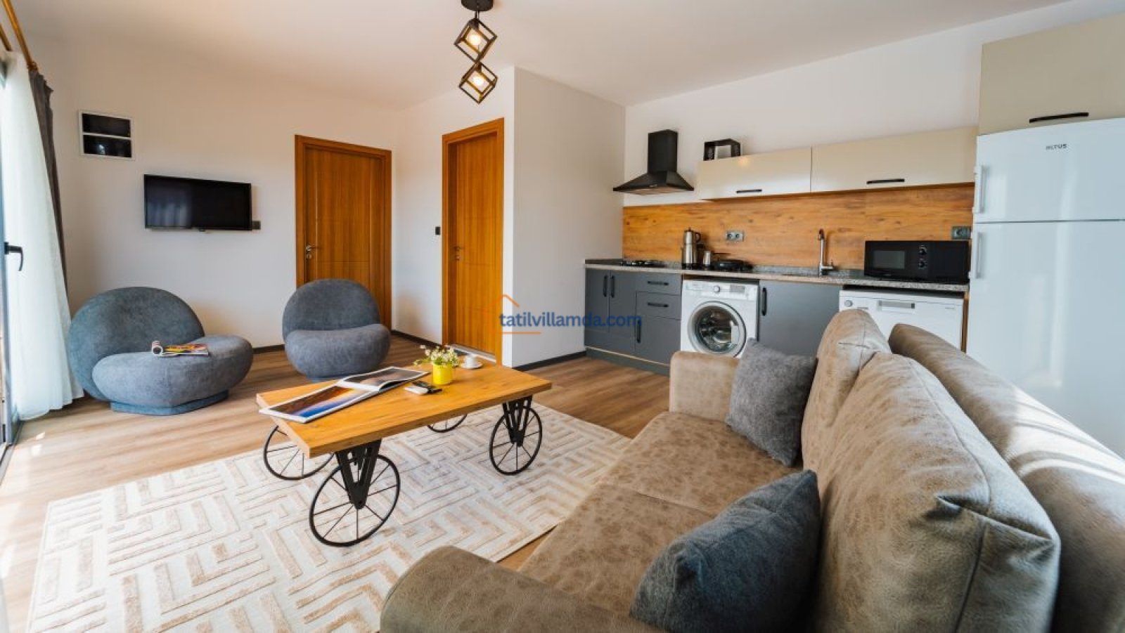 Villa, 1 yatak odası ve 1 salondan oluşur. Yatak odasında rahat bir çift kişilik yatak bulunurken, salondaki açılabilir koltuk 200×140 cm ölçülerinde olup, gerektiğinde ek yatak olarak kullanılabilir. Bu sayede villa, küçük aileler veya arkadaş grupları için de uygundur.