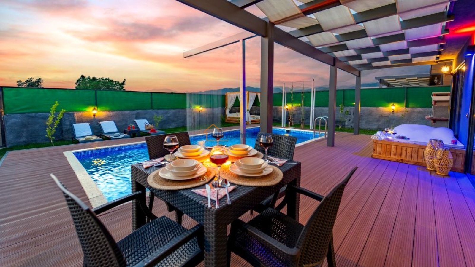 Korunaklı özel havuzu, dışarıdan görünmeyecek şekilde tasarlanmıştır, böylece tatilinizi huzur içinde geçirebilirsiniz. Havuz başında bir salıncak ve dinlenmek için keyifli bir ahşap loca kamelya mevcuttur. Gün boyu güneşlenip, akşamüstü serin bir içecekle gün batımını izleyebilirsiniz. Ayrıca villanın jakuzisi, tatilinize ekstra bir rahatlama ve lüks katacaktır.
