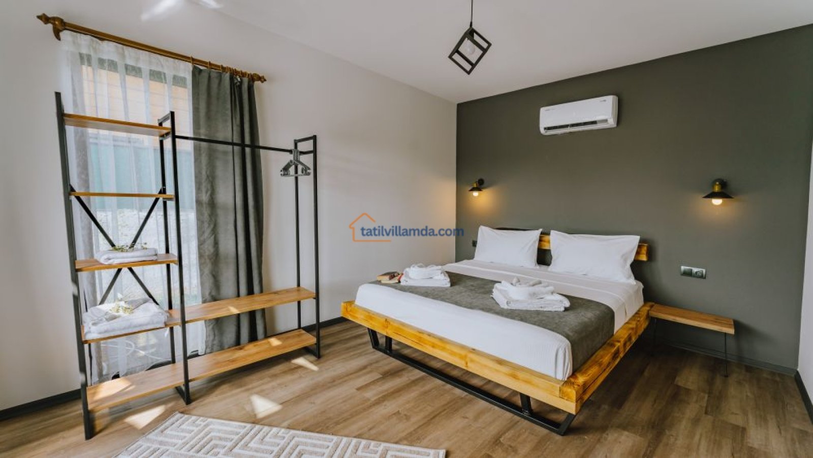Villa, 1 yatak odası ve 1 salondan oluşur. Yatak odasında rahat bir çift kişilik yatak bulunurken, salondaki açılabilir koltuk 200×140 cm ölçülerinde olup, gerektiğinde ek yatak olarak kullanılabilir. Bu sayede villa, küçük aileler veya arkadaş grupları için de uygundur.