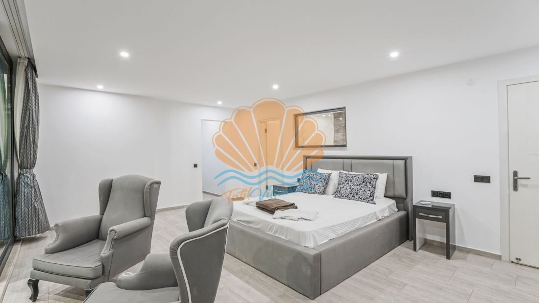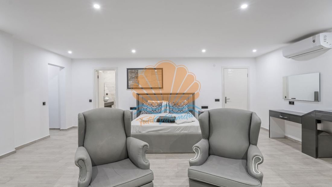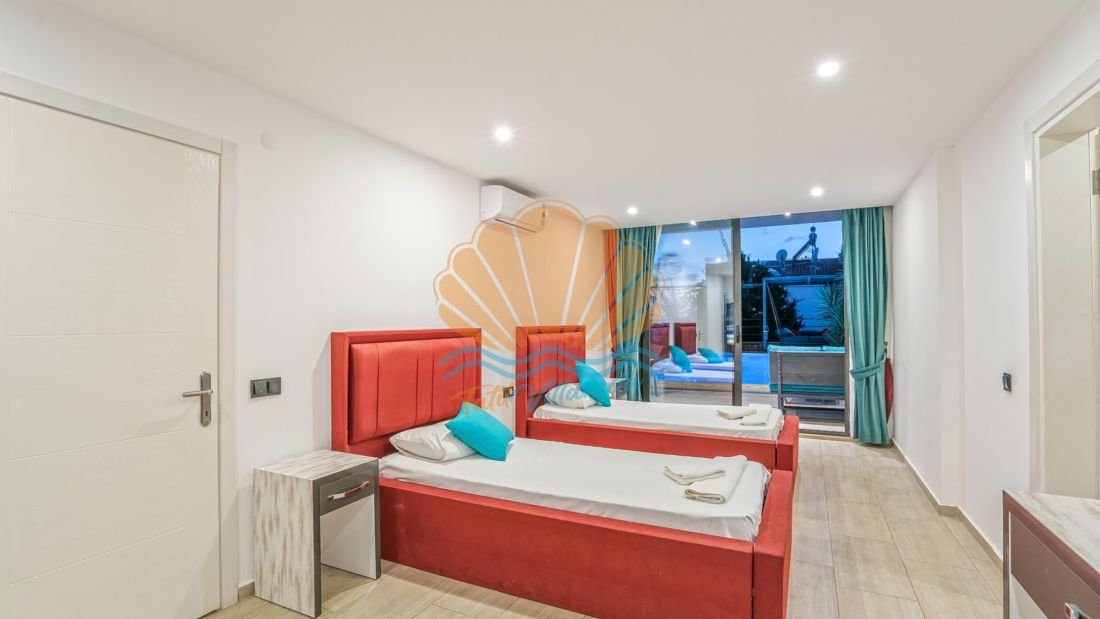 Toplam 4 yatak odasına sahip olan villa, 8 kişilik konaklama kapasitesine sahiptir. Tüm yatak odaları ebeveyn banyoludur ve misafirlerine maksimum konfor ile mahremiyet sağlar. Teras katında bulunan yatak odasında yer alan jakuzi ise deniz manzarası eşliğinde dinlenmek isteyen misafirler için ayrıcalıklı bir detaydır. Gün batımında jakuzide keyif yapmak tatilinize unutulmaz anlar katacaktır.